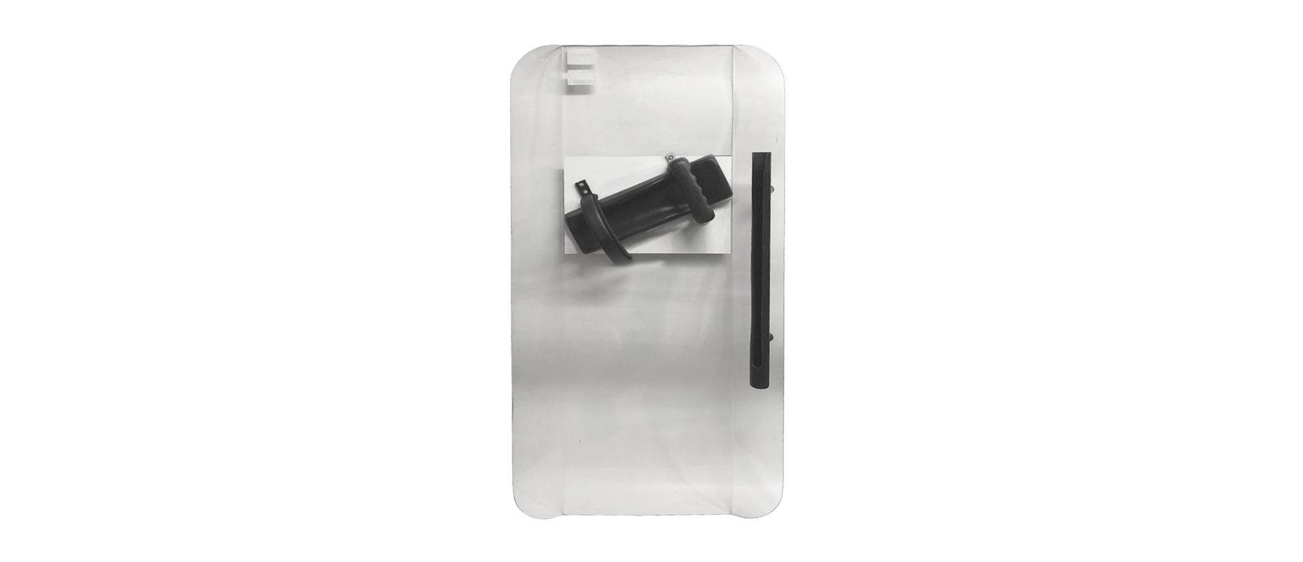Escudo antimotín ERATAS policarbonato inyectado 4mm plano manija metálica con forro de caucho sujetador de brazo polímero flexible protector de brazo de espuma de alta densidad lados biselados para mejor absorción de golpes y porta varas dimensiones 120x58 cm