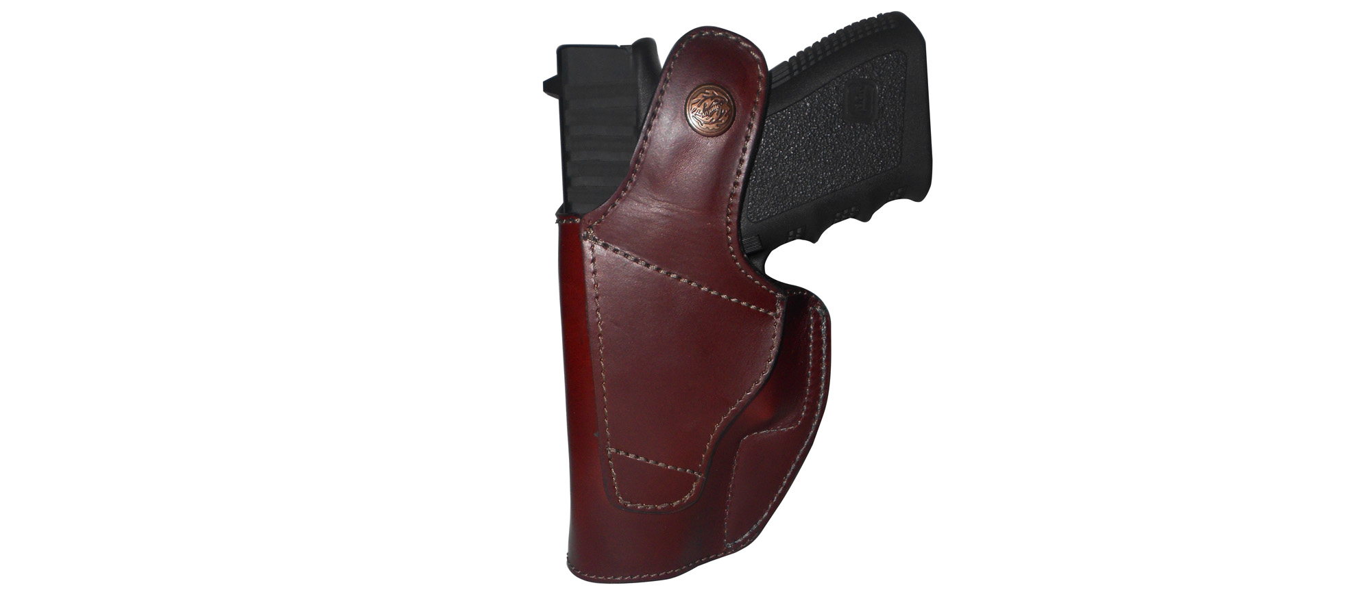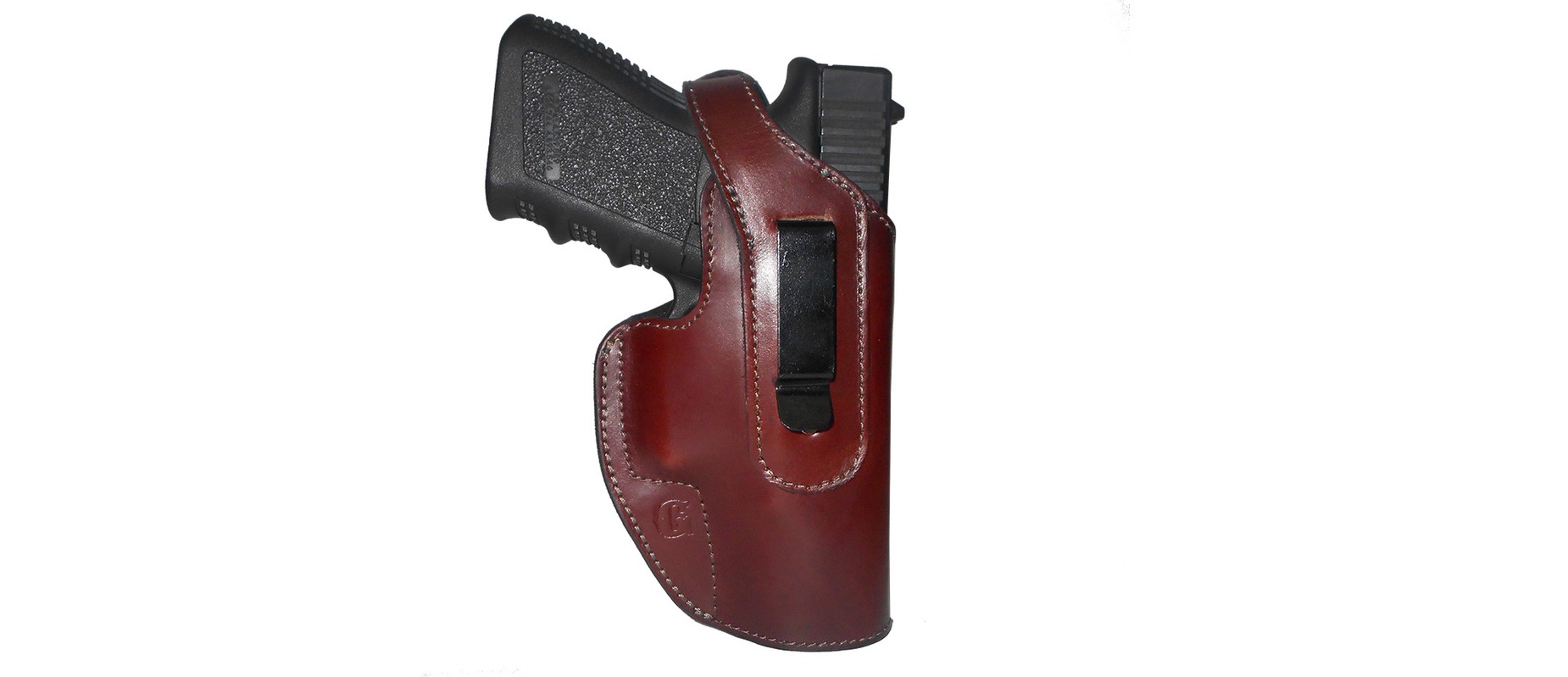Funda para pistola Glock 19/25 de cuero marrón interna con clip y externa con ojal sujeción con broche para diestro