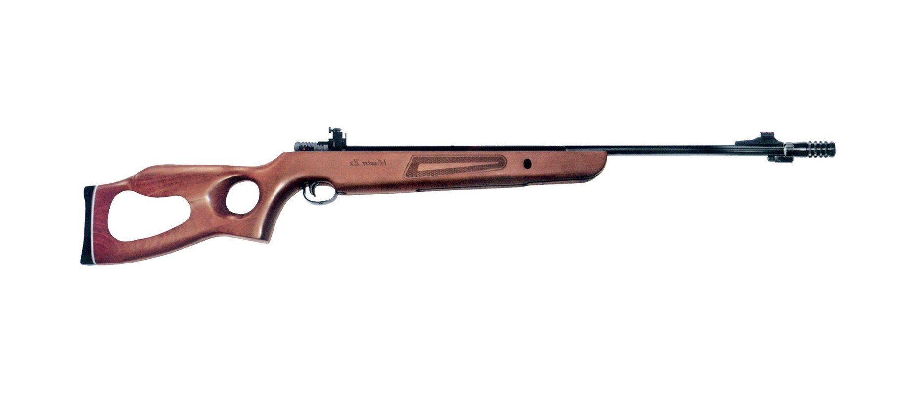 Moderna culata ergonómica y ambidiestra de madera importada, terminada en color natural. Mira micrométrica cerrada. Punto de mira con fibra óptica. Cañones intercambiables cal. 4.5 y 5.5 mm. Seguros automáticos de quiebre de cañón y de disparador.