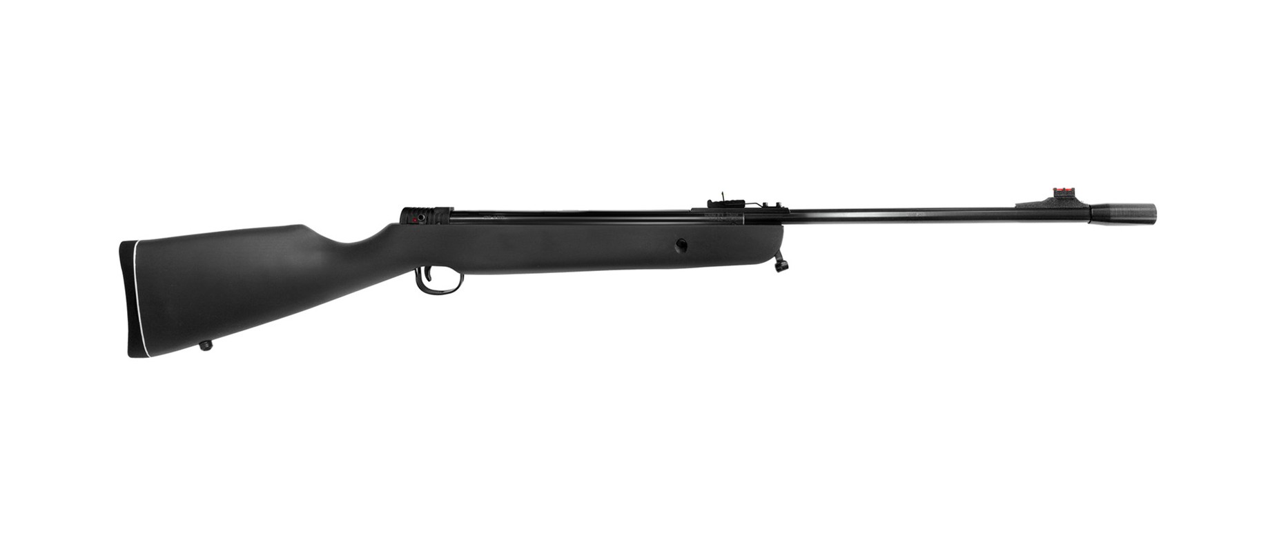 Culata de madera importada, terminada en color grafito. Mira abierta estándar. Y punto de mira con fibra óptica. Seguros automáticos de quiebre de cañón y de disparador.