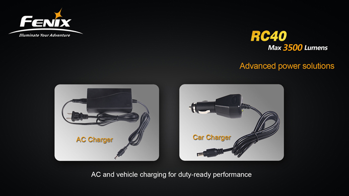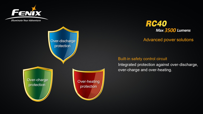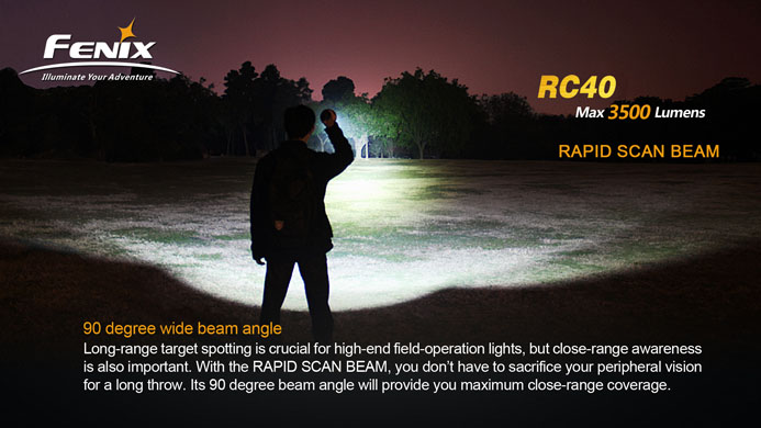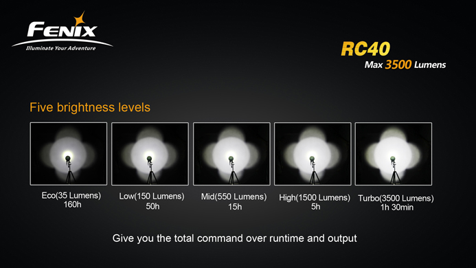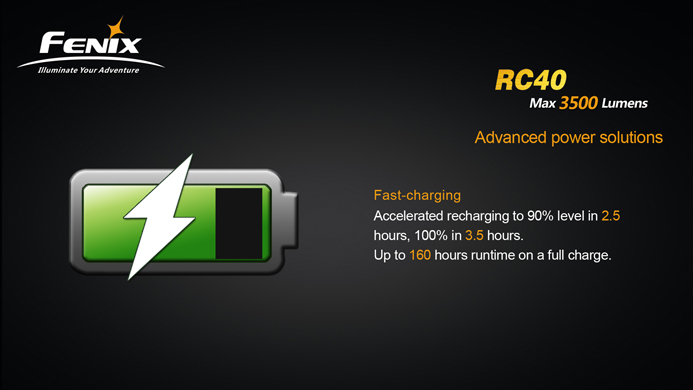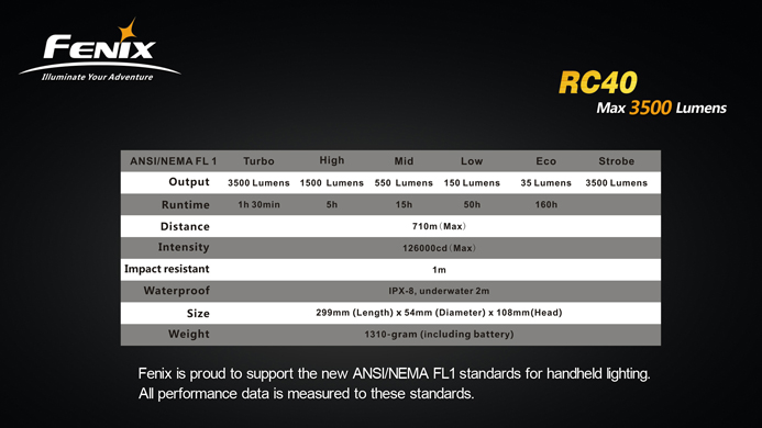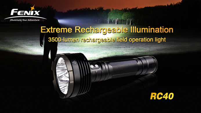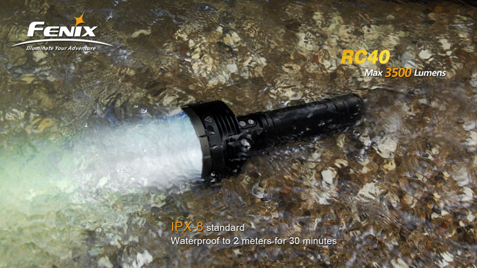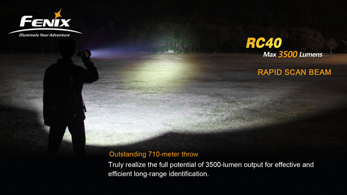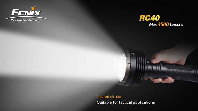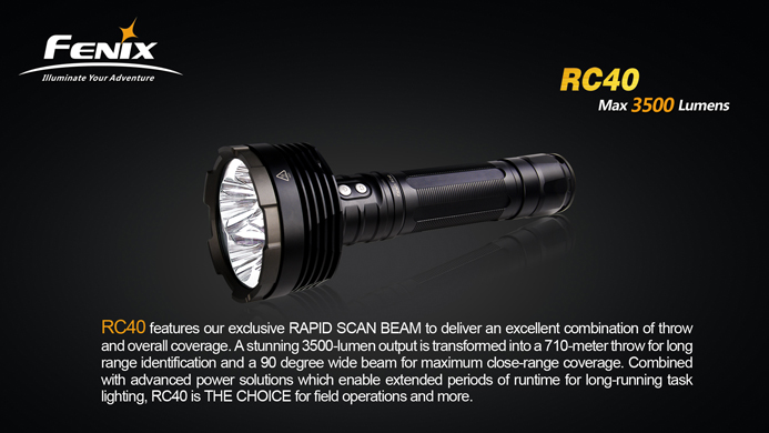 Linterna FENIX RC40 potencia de 35 a 3500 lúmenes 4 niveles de poder alcance máximo 710m sumergible 2m soporta impactos a 1m de distancia recargable duración máxima 160H