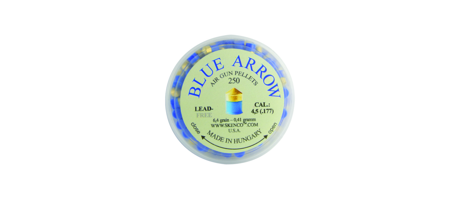 Balines calibre 4.50 SKENCO BLUE ARROW punta cónica lata de 250 unidades peso 0.41g/6.4gr cuerpo plástico color azul y punta de bronce LF25045040