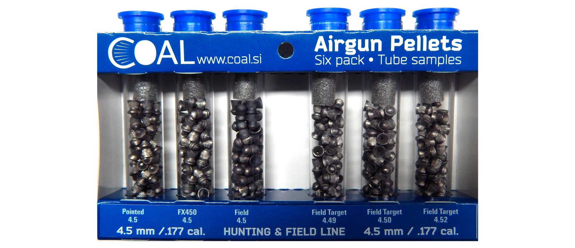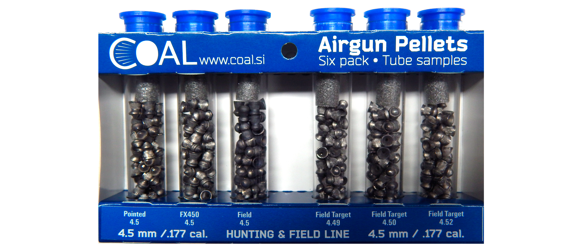 Pack de Muestras calibre 4.5 COAL HUNTING & FIELD LINE contiene 6 tubos de 40 und. balines Pointed, FX450, Field, Field Target 4.5, Field Target 4.49 y Field Target 4.51 6TS-HF45