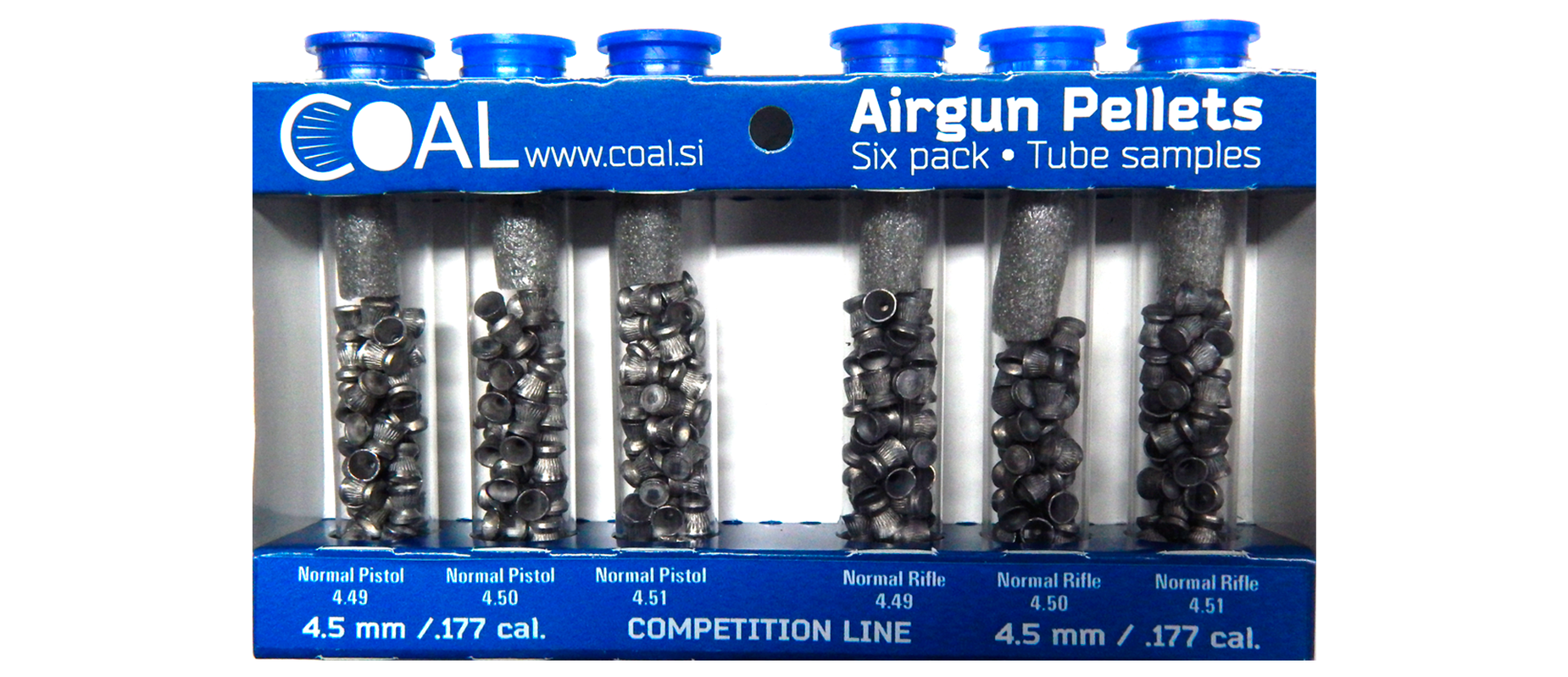 Pack de Muestras calibre 4.5 COAL COMPETITION contiene 6 tubos de 40 und. balines Normal (Pistol 4.49, Pistol 4.50 ,Pistol 4.51 ,Rifle 4.49, Rifle y 4.50 Rifle 4.51) 6TS-CP45