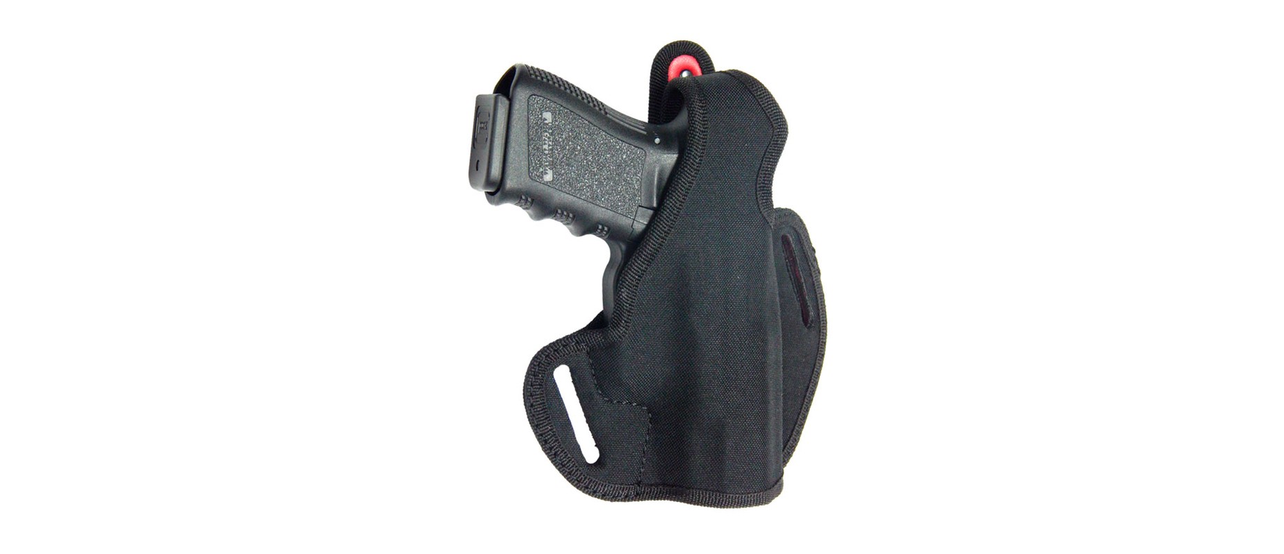 Funda para Pistola MASC GFT-110 KAPADOKYA ( 1014 ) para GLOCK 19/25 de lona reforzada color negro tipo externa seguro ojal con broche sujecion a correa con ojales tipo orejas (M18)