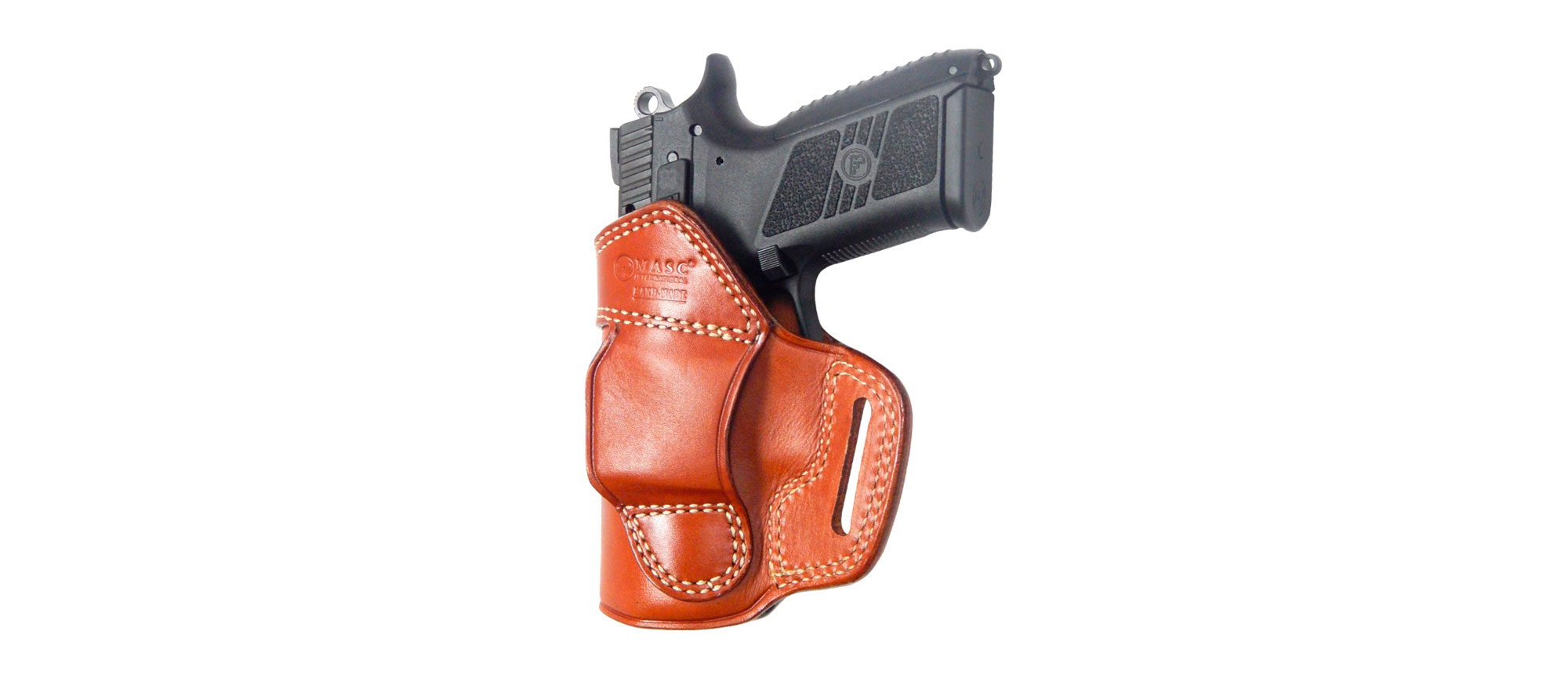 Funda para Pistola MASC GF-115 ZIMAR ( 1012 ) para CZ 75 P-07 DUTY de cuero color marrón tipo externa seguro a presion sujecion a correa con ojal interno y otro tipo oreja (M9)