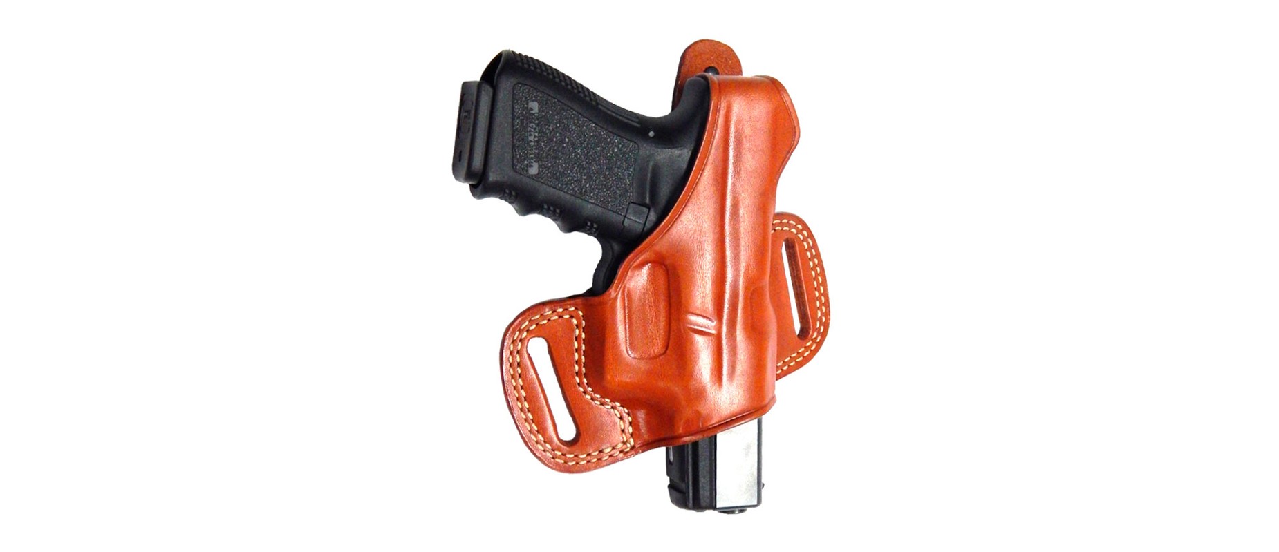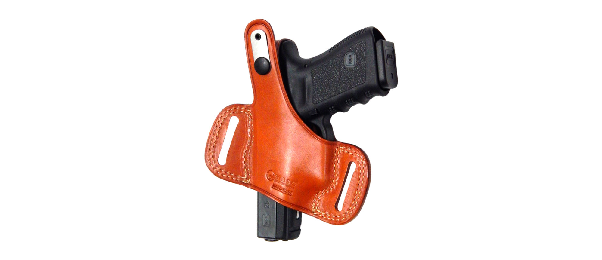 Funda para Pistola MASC GF-125 TRUVA ( 1017 ) para GLOCK 26/28 de cuero color marron tipo externa seguro ojal con broche sujecion con 2 hojales tipo orejas (M10)