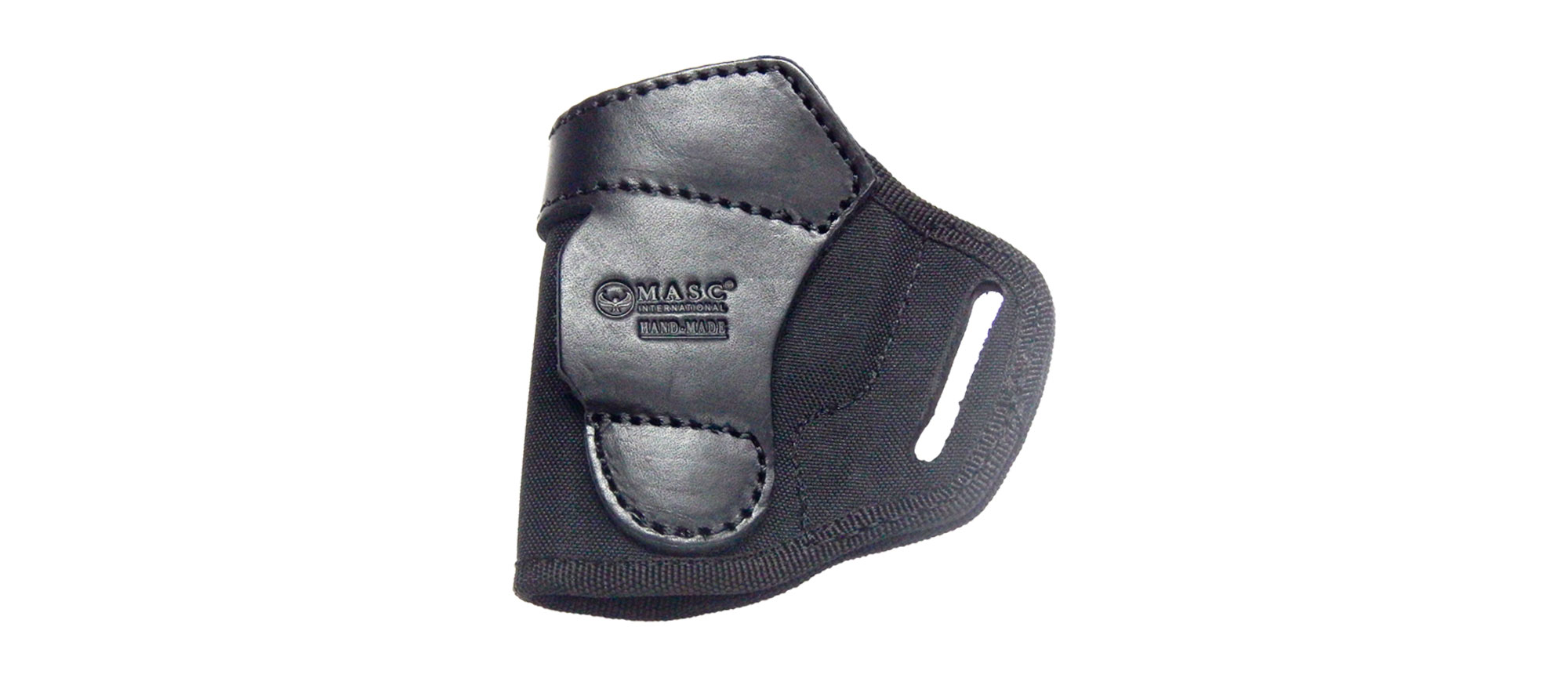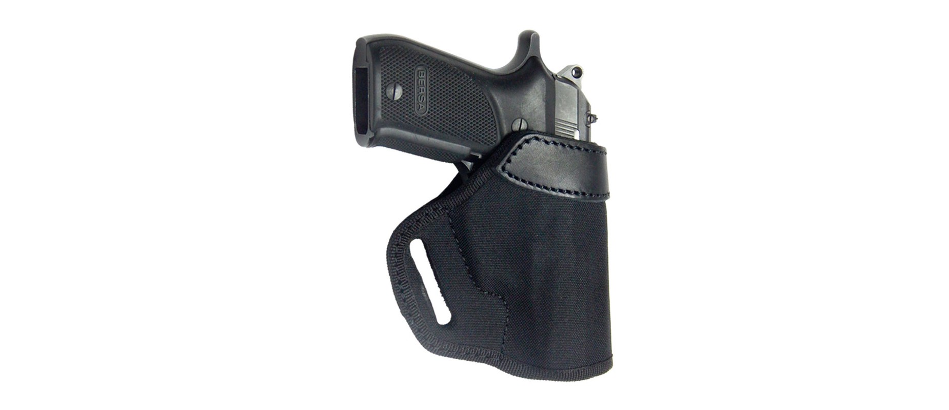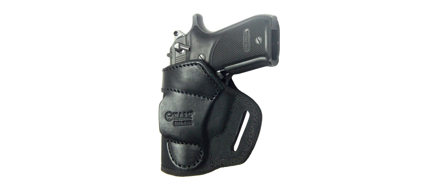 Funda para Pistola MASC GFT-115 RUMELI ( 1006 ) para BERSA 380 de lona color negro tipo externa seguro a presion sujecion con ojal interno de cuero y otro tipo oreja (M19)