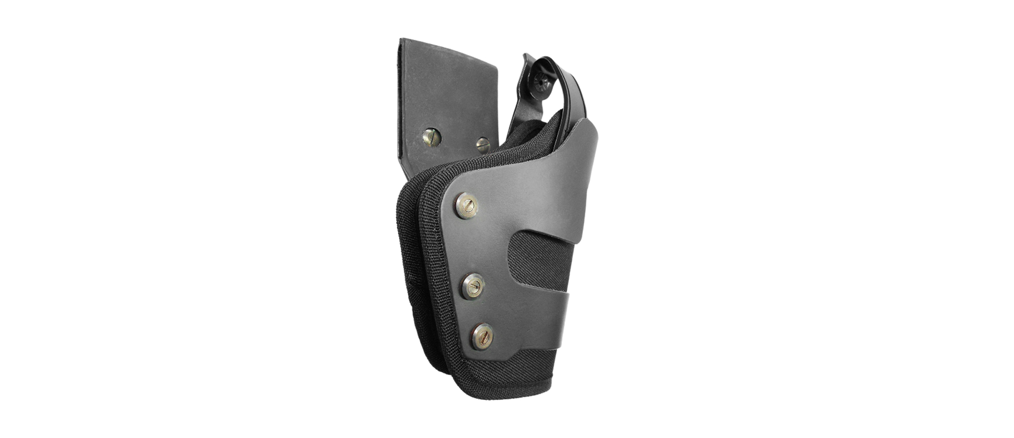 Funda para pistola HOUSTON 77A universal de lona y cuero color negro seguro con broche ajustable por ambos lados sujeción de polímero a la correa con sistema rotativo (Argentina)