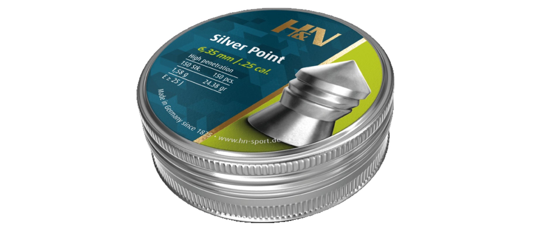 Balines calibre 6.35 H&N SILVER POINT punta cónica de alta penetración lata de 150 unidades peso 1.58g/24.38gr (Alemania)