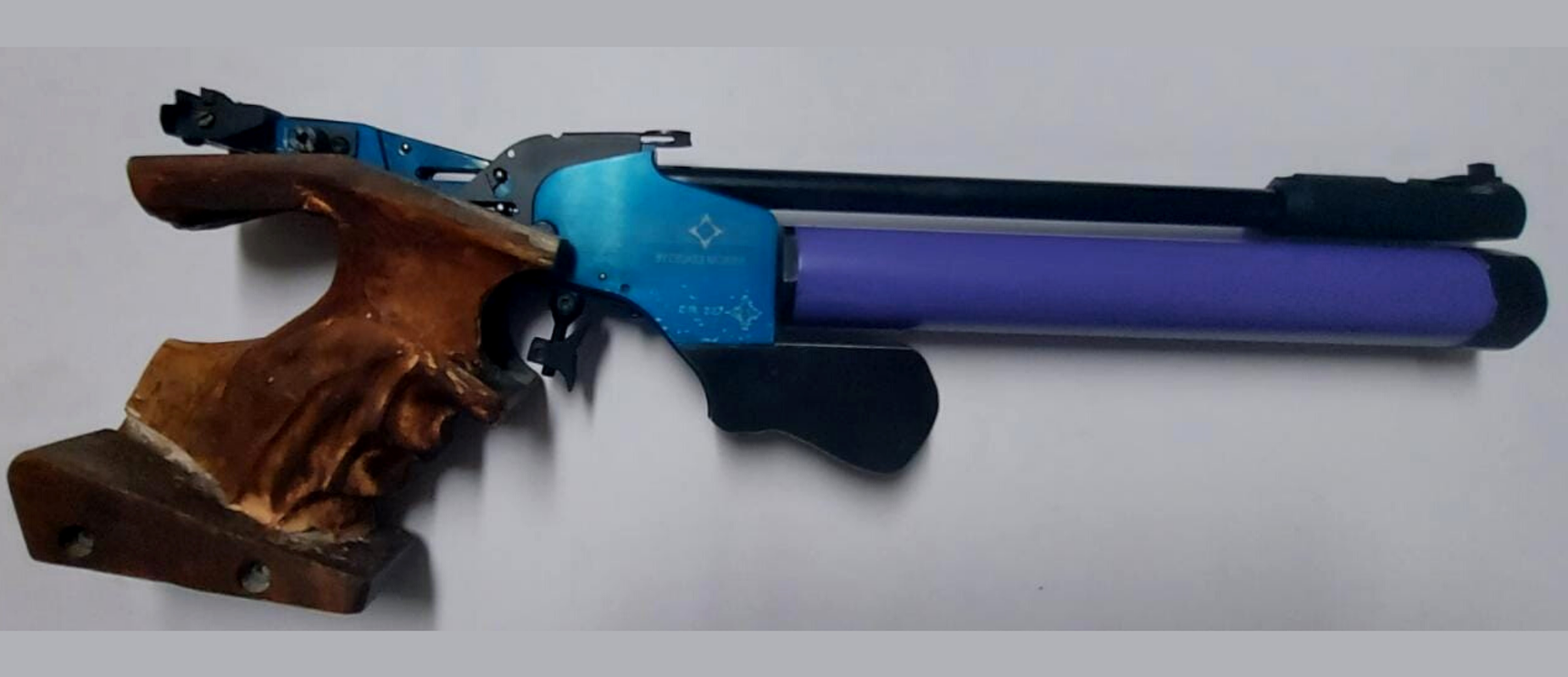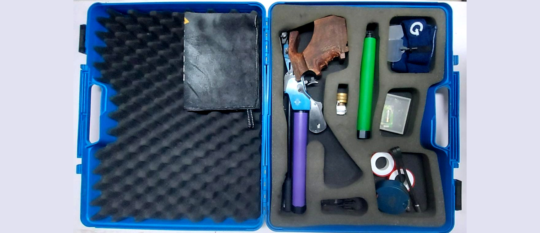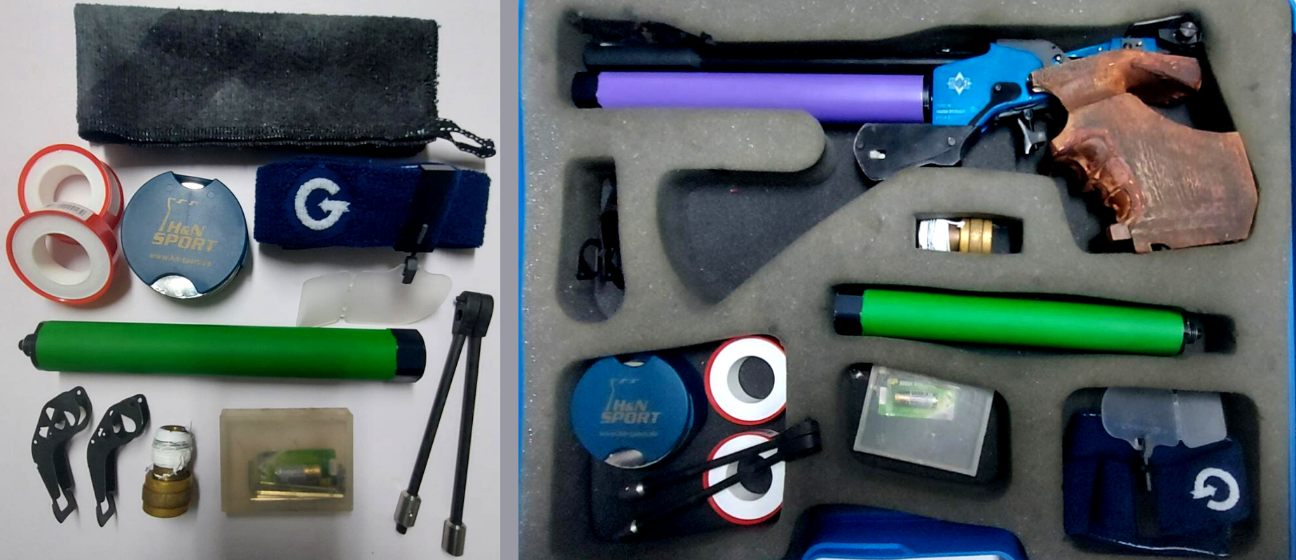 Pistola de aire MATCH GUNS by Cesar Morini modelo 1090 AE, calibre 4.5mm, viene en estuche de plástico original, 1 cilindro adicional color verde, 1 válvula, 1 par de piezas negras de metal, 2 cintas de teflón, 1 venda para ojo, 1 caja pequeña que incluye llaves y batería, 1 lata de balines H&N Sport, 1 porta lata de balines, 1 pieza negra tipo bípode y franela