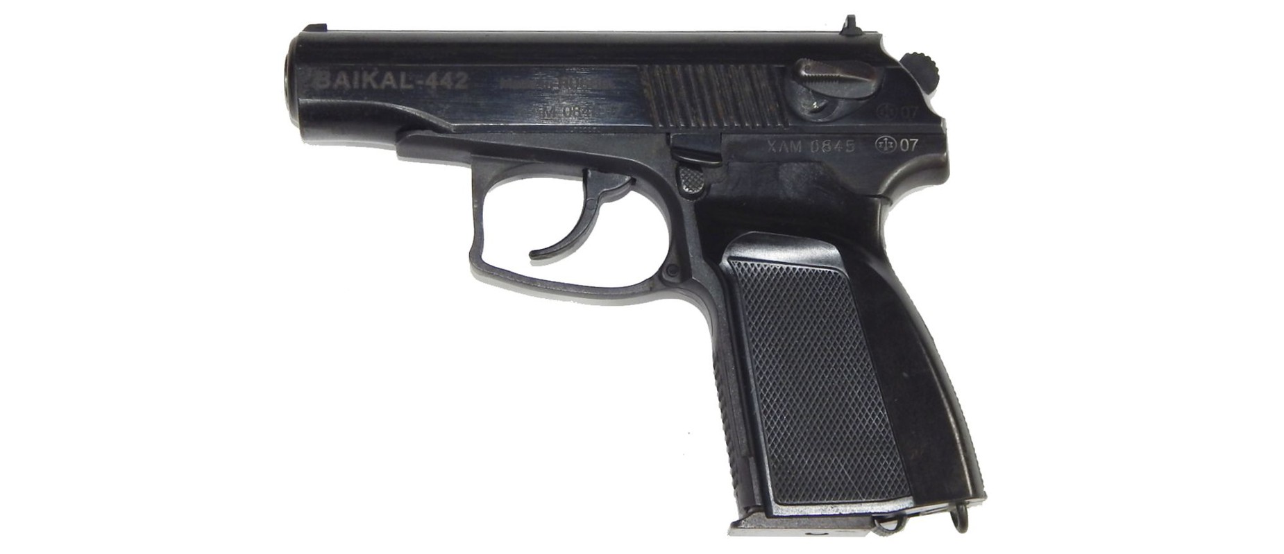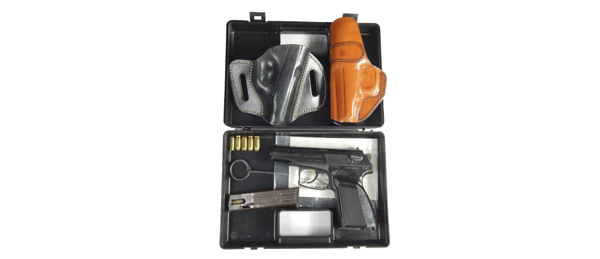 Pistola Usada Baikal 442 calibre 9mm Makarov incluye 02 cacerinas de 12 tiros estuche plstico negro, 02 fundas internas de cuero y municiones 45 Hornady Defense y 55 Winchester FMJ