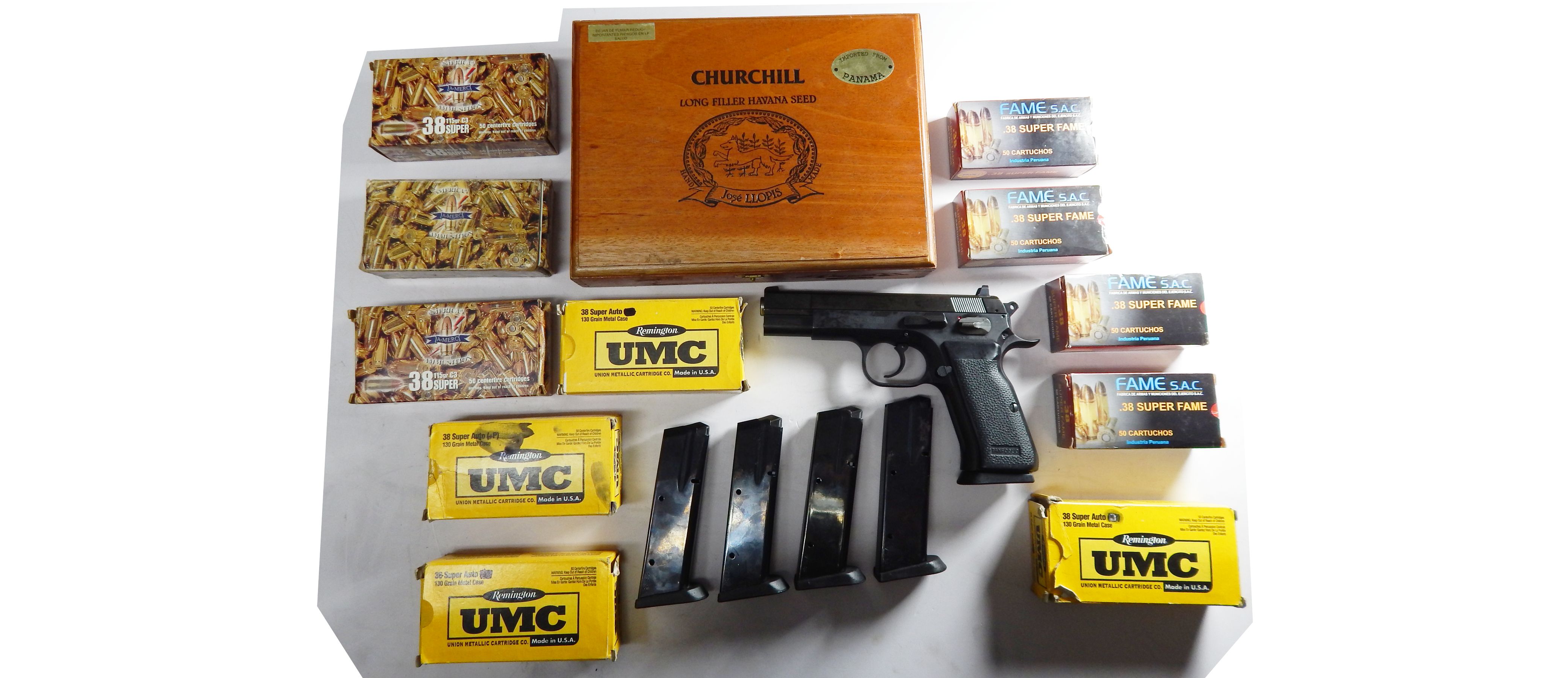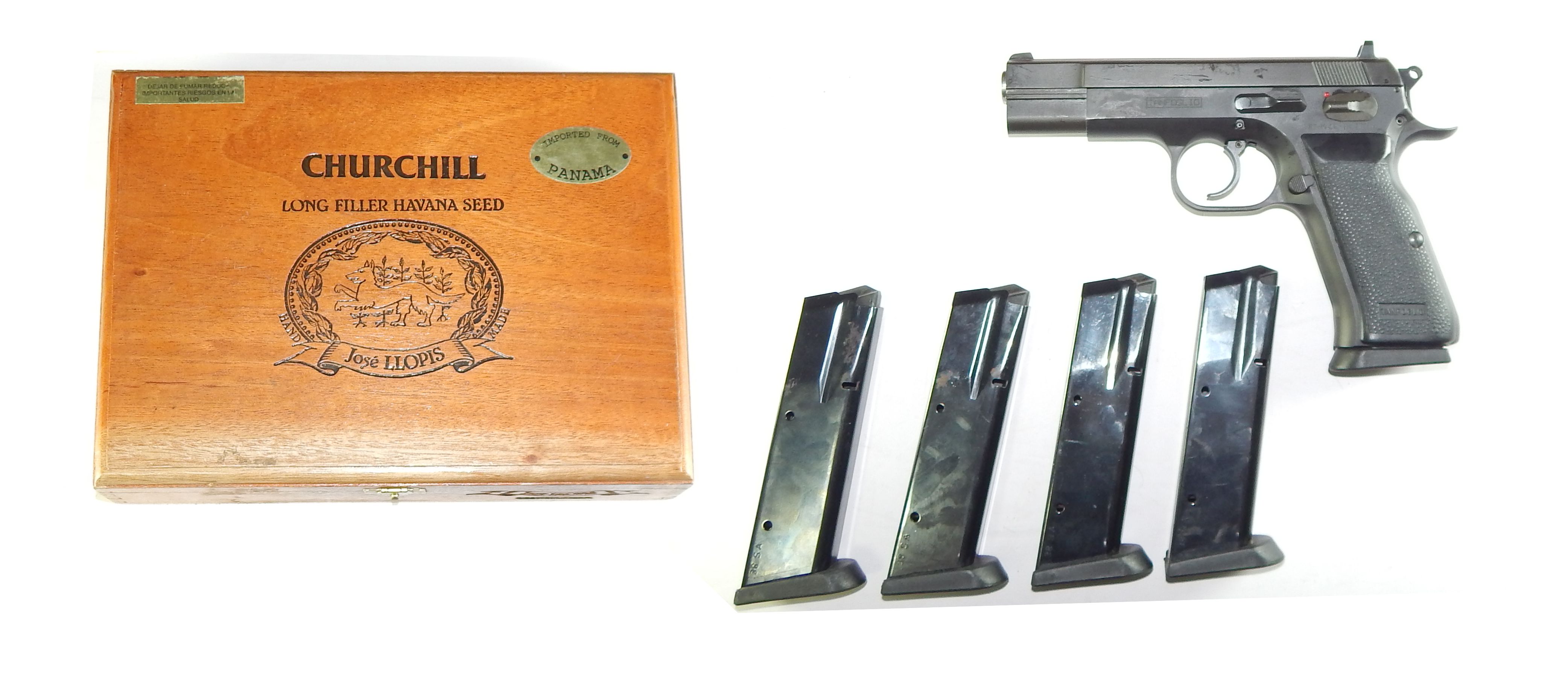 Pistola Tanfoglio P23 calibre .38 Super Auto incluye 05 CAcericas de 15 tiros Funda de Cuero, Caja de Madera y 54 Municiones de diferentes marcas en excelente estado de concervacion poco uso