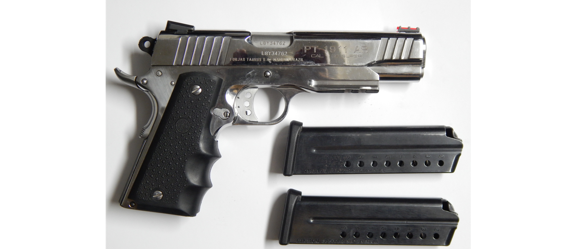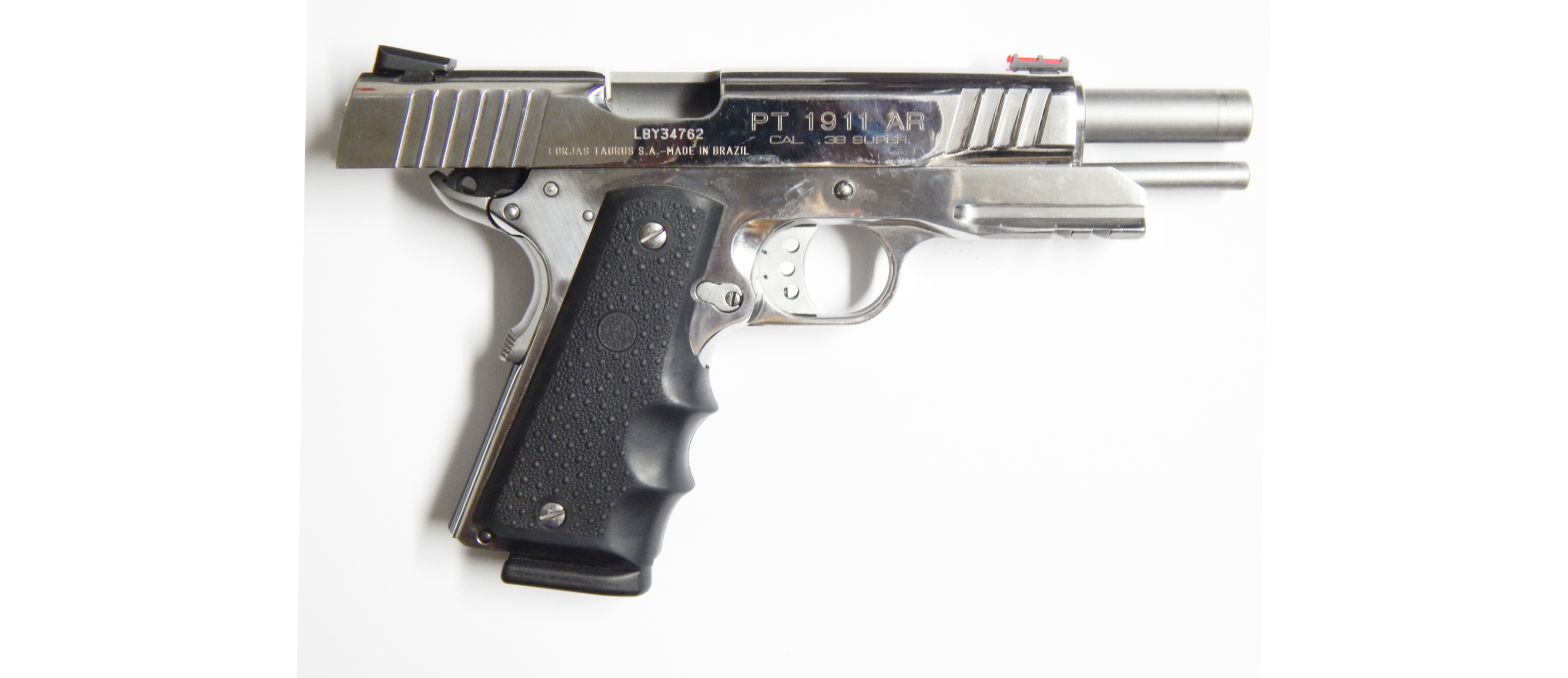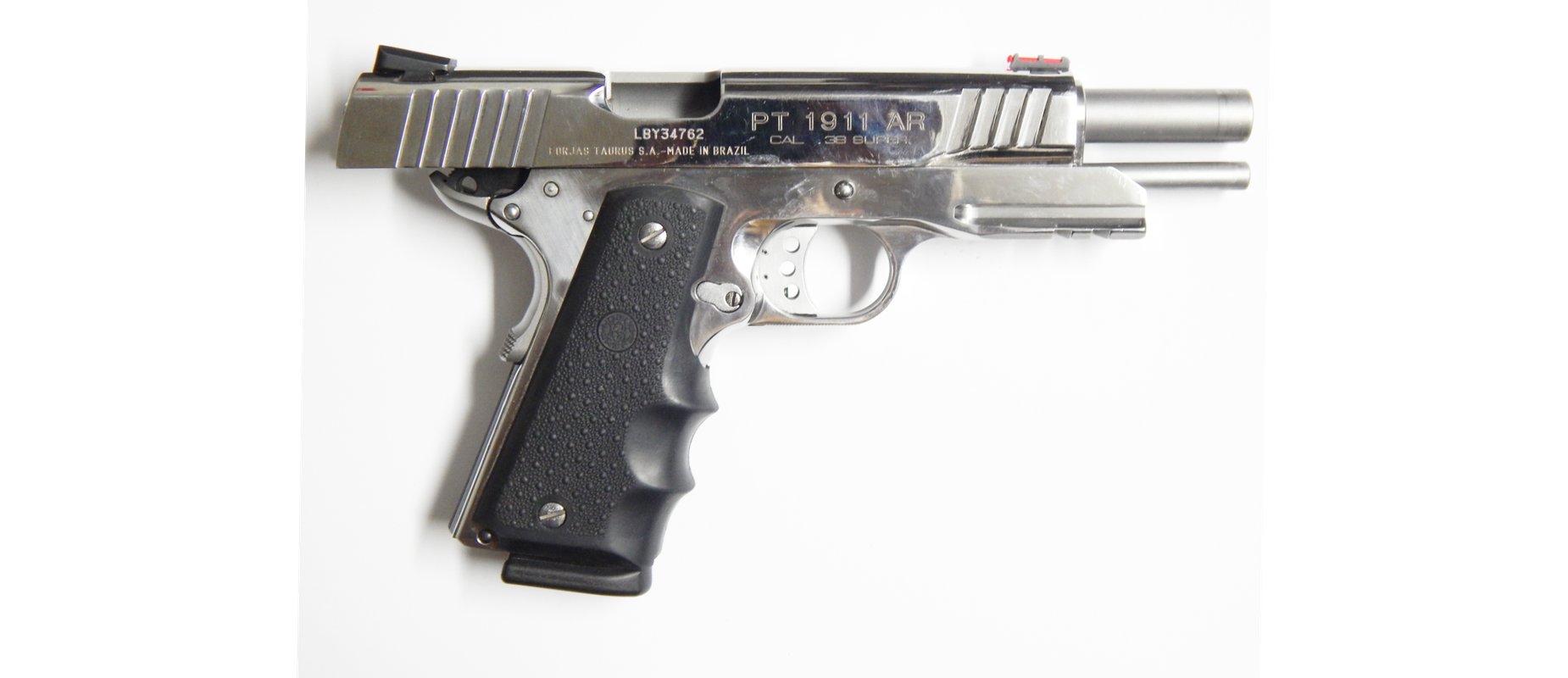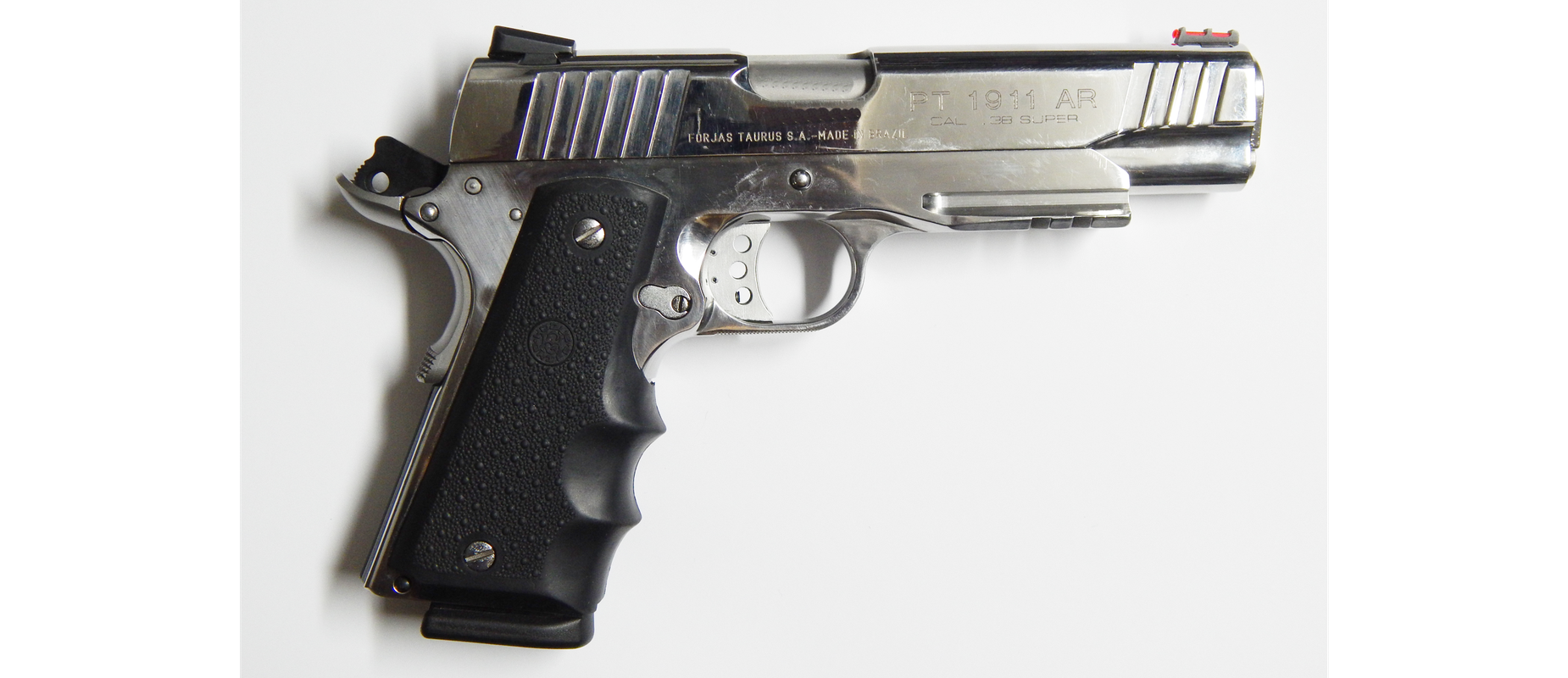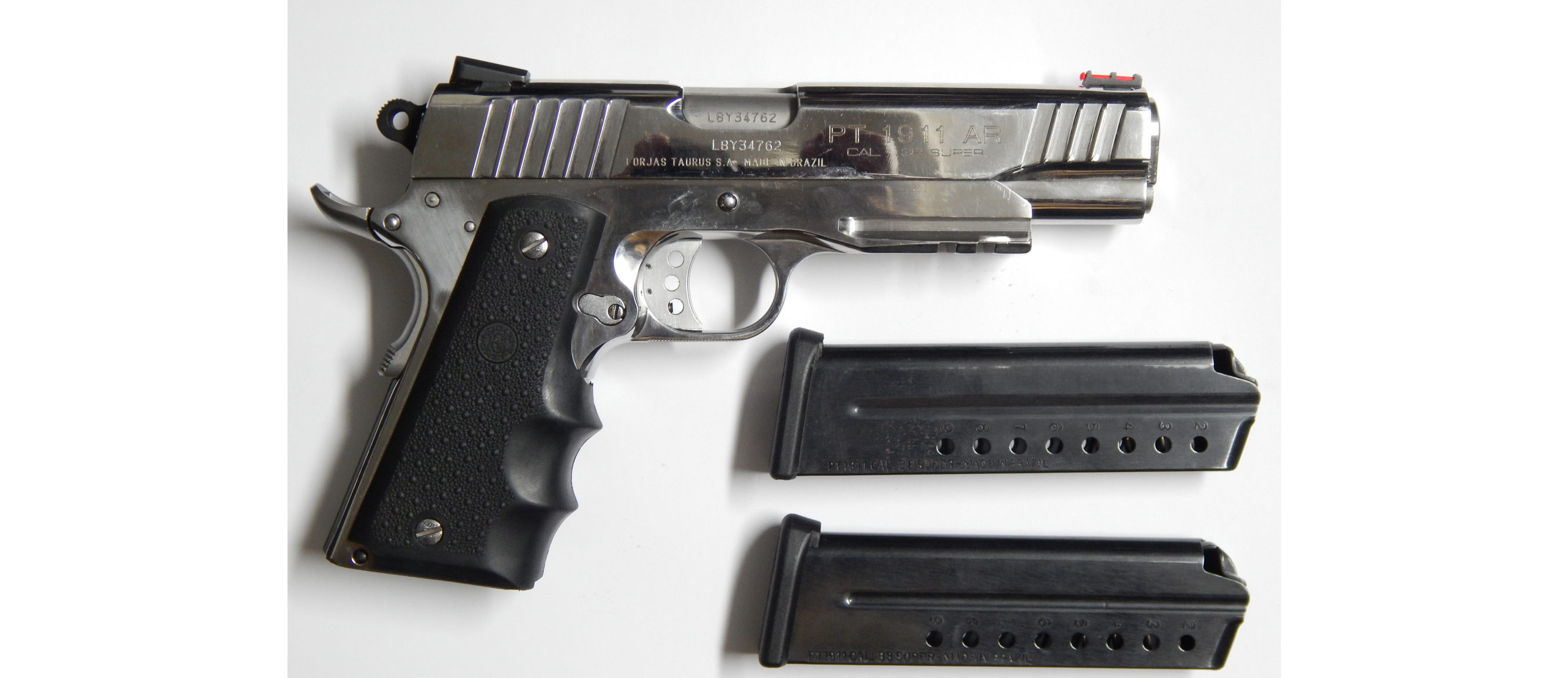 Pistola usada TAURUS PT 1911 AR calibre 38 super acabado acero inoxidable brillantes en muy buen estado poco uso Incluye 02 Cacerinas de 09 tiros largo del cañon 5 pulgadas