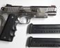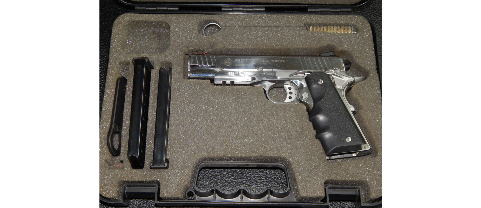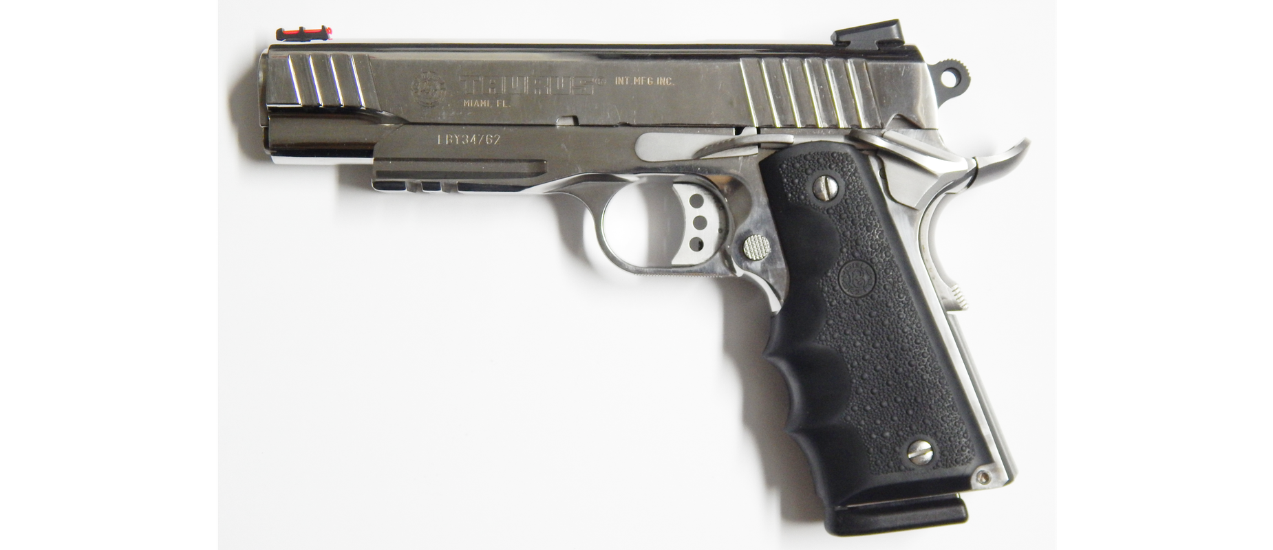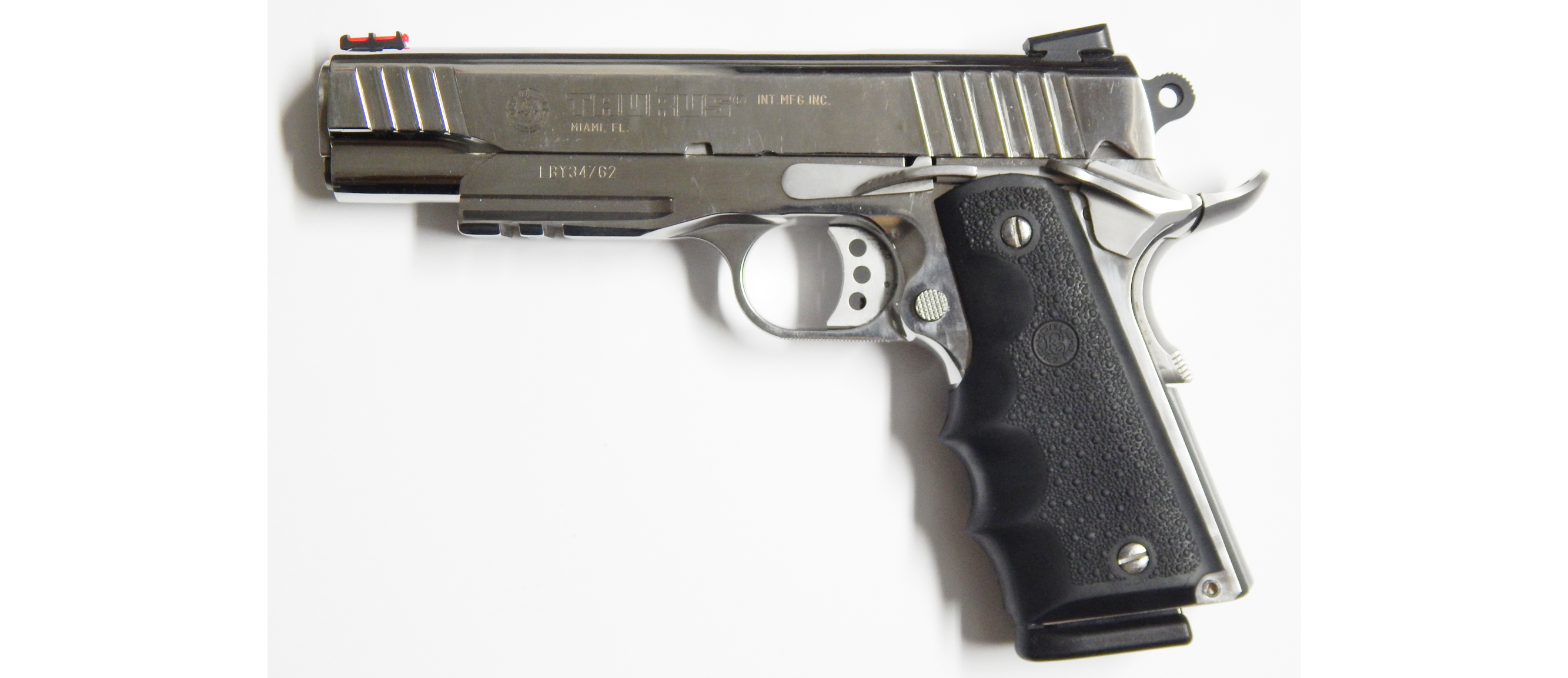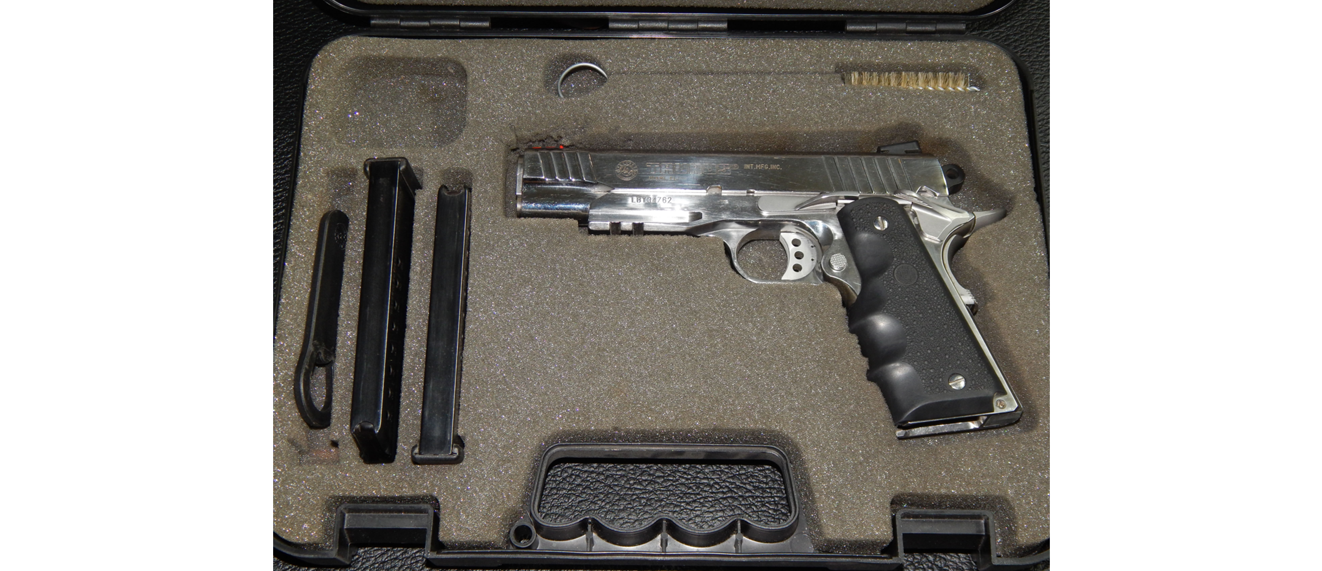 Pistola usada TAURUS PT 1911 AR calibre 38 super acabado acero inoxidable brillantes en muy buen estado poco uso Incluye 02 Cacerinas de 09 tiros largo del cañon 5 pulgadas