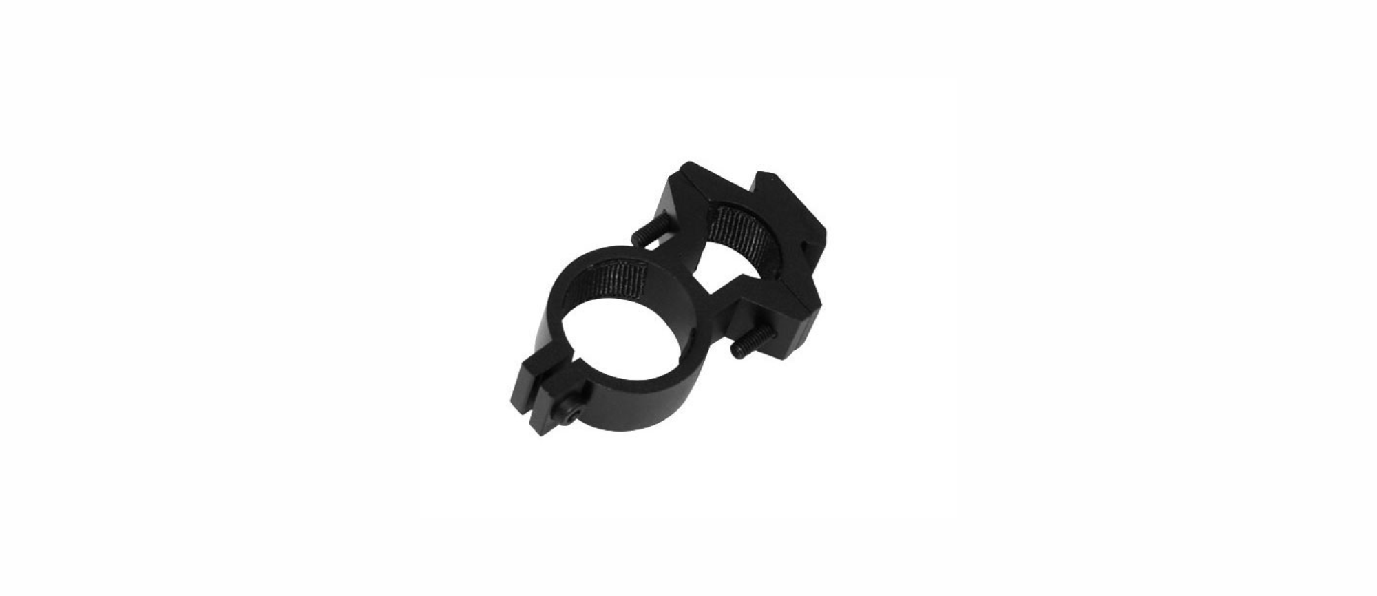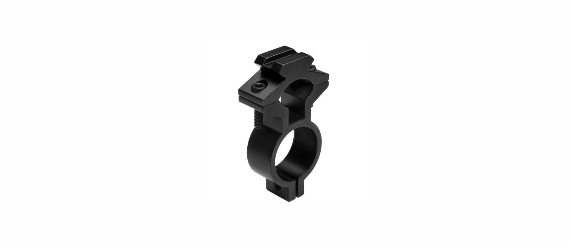 Base NcSTAR para montar en cañón universal de hasta 0.75 pulg. de diametro con anillo para linterna riel picatinny a los lados de acero pavonado MUBM