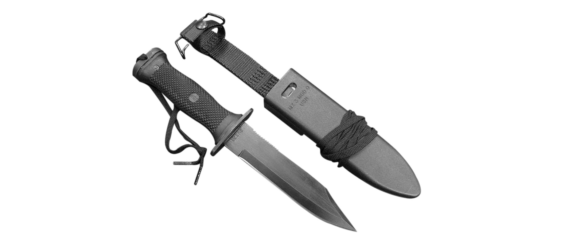 Cuchillo ONTARIO MARK 3 NAVY táctico hoja de acero inoxidable negro hoja de filo plano y sierra del otro lado con funda de metal recubierto con plástico color negro 216-6141