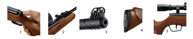 Caracteristicas 1.)El seguro automático ambidiestro está especialmente conectado en la parte posterior de la carcasa y se llega fácilmente para accionarlo y desconectarlo también durante el apunte. El seguro automático en la carcasa proporciona un nivel de seguridad mayor de los seguros montados en el grupo guarda-mato. 2.)La muesca de mira de alta precisión se regula mediante virolas numeradas para la regulación de derivación y elevación y está dotada de inserciones de fibra óptica verdes que aseguran máxima visibilidad. 3.)La mira está protegida y está dotada de una inserción de color rojo de fibra óptica que asegura una adquisición del blanco rápida y exacta. El manguito porta-mira con diseño ergonómico permite utilizar fácilmente el potente sistema muelle-pistón. 4.) Los modelos X5 están disponibles con culata de tipo Monte Carlo para una adquisición del blanco fácil y rápido. Las culatas están disponibles de Hardwood y sintético negro, totalmente cuadrillado. 5.) El guardamonte de polímero de alto impacto permite una protección adecuada del gatillo de dos estados. El gatillo está regulado de fábrica. |