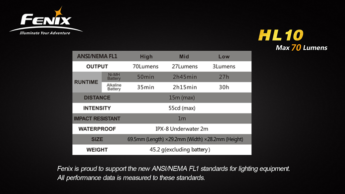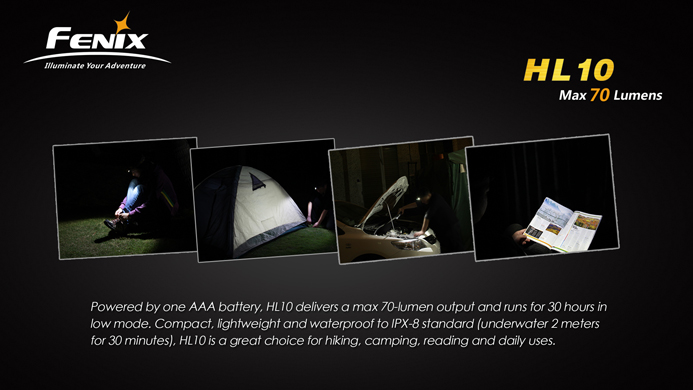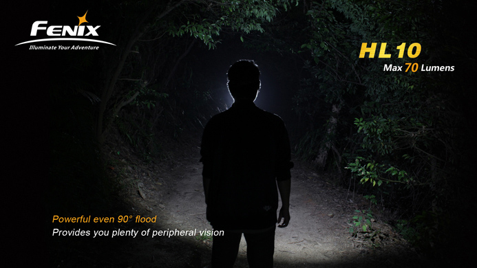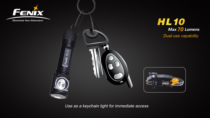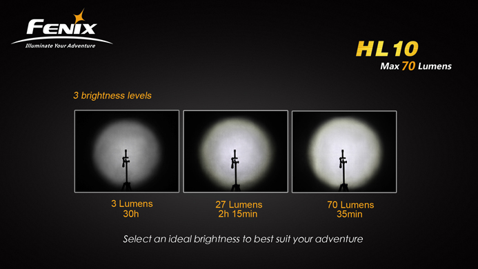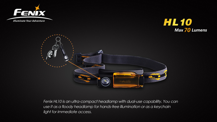 Linterna de cabeza FENIX HL10 potencia de 3 a 70 lumenes 3 niveles de poder alcance máximo 15m resistente al agua e impactos a 1m de distancia utiliza 01 pila AAA