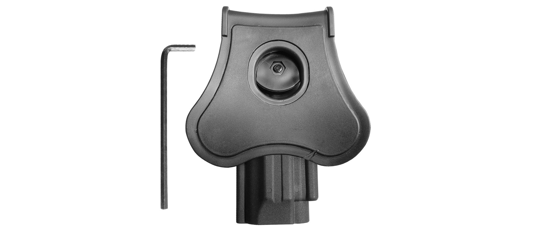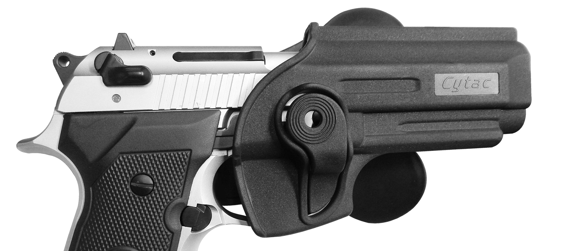 Funda para pistola CYTAC CY-T19/T100 para Beretta 92FS y Taurus PT92 de polímero color negro con seguro automático tipo botón fijación a correa y tipo paleta rotativa (China)