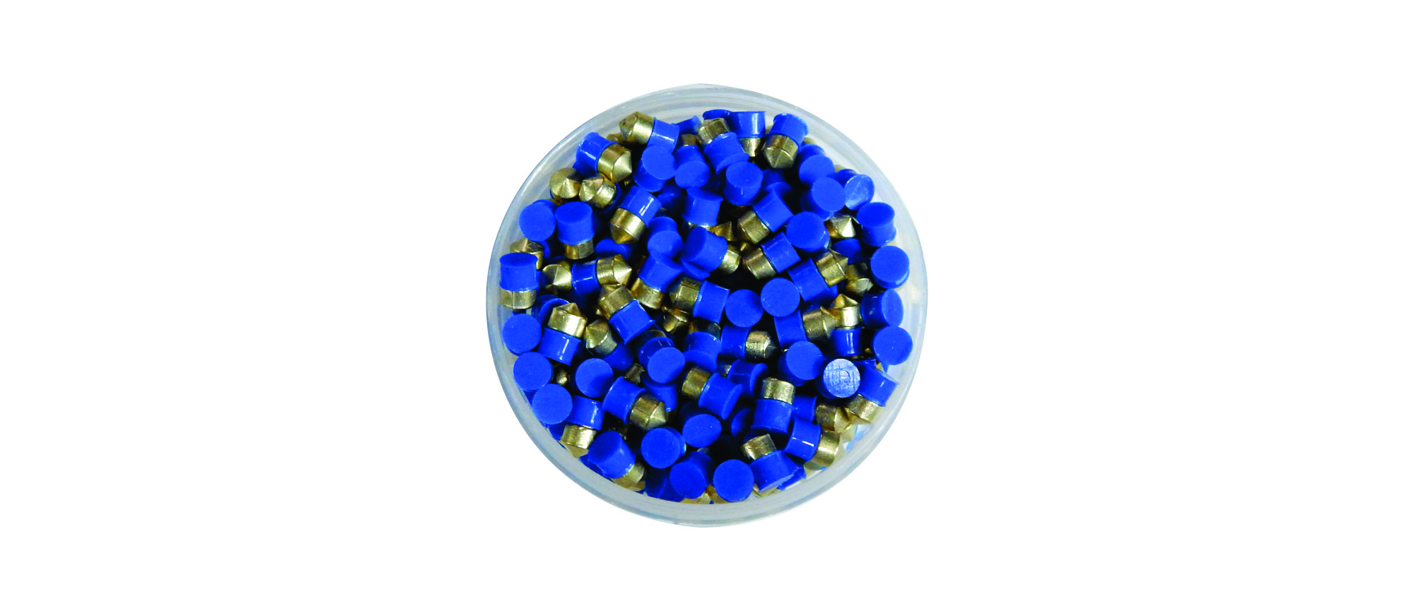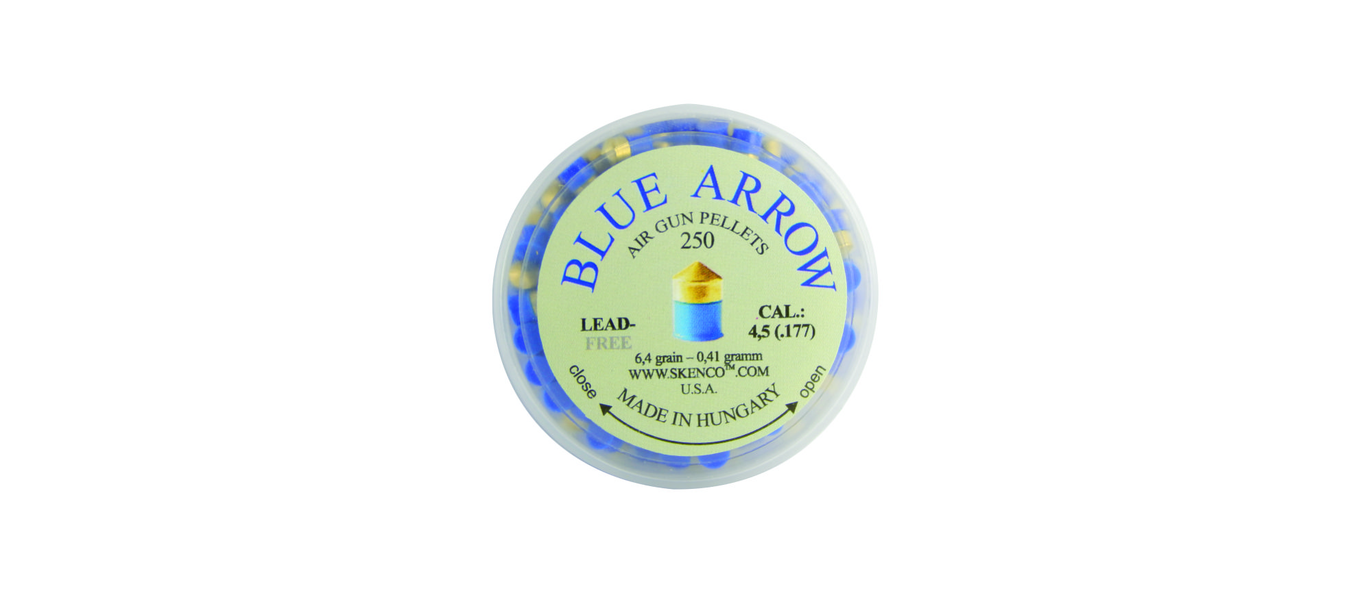 Balines calibre 4.50 SKENCO BLUE ARROW punta cónica lata de 250 unidades peso 0.41g/6.4gr cuerpo plástico color azul y punta de bronce LF25045040