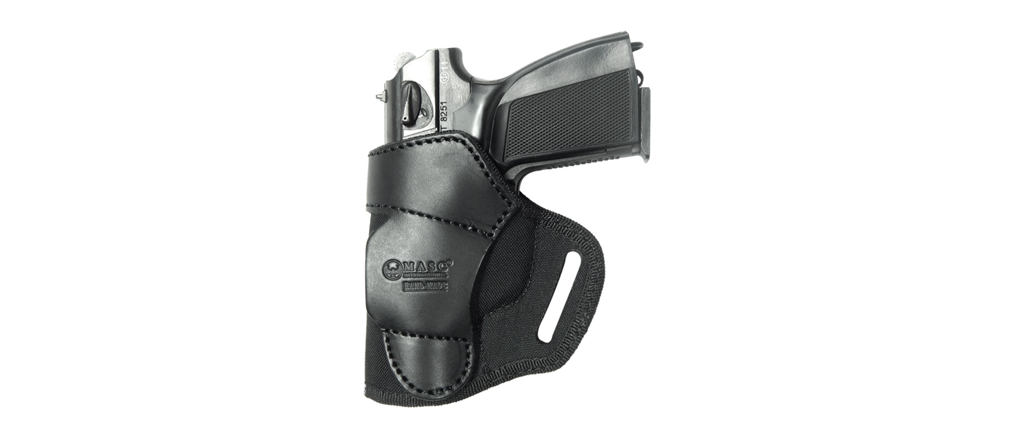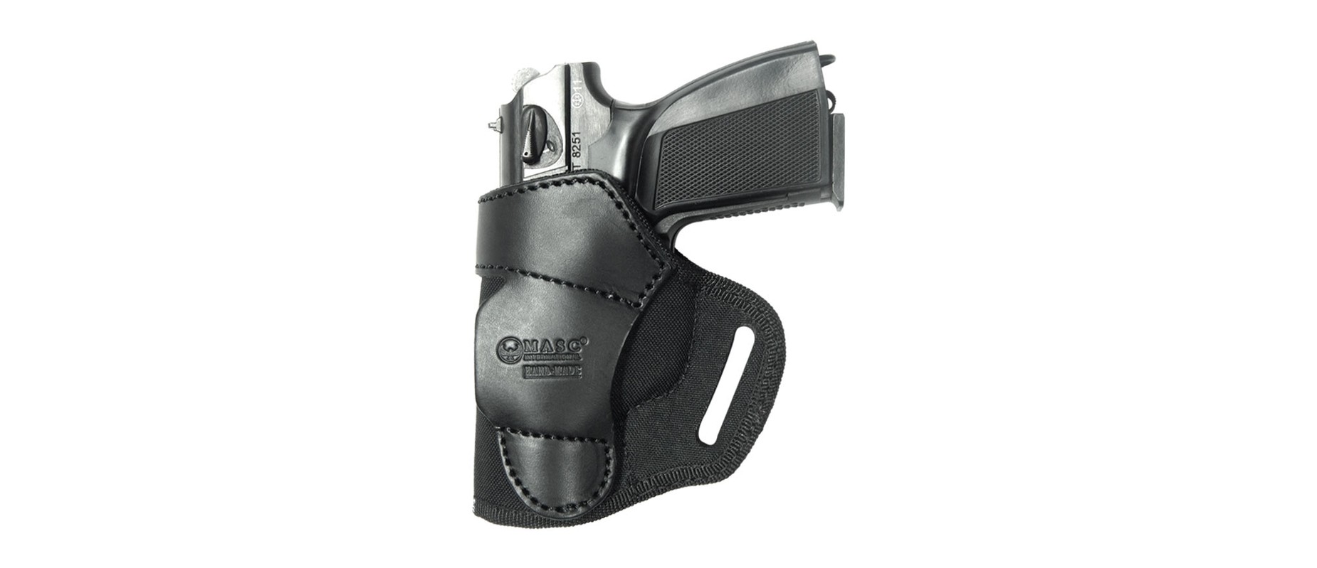Funda para Pistola MASC GFT-115 RUMELI ( 1190 ) para BAIKAL/MAK de lona color negro tipo externa seguro a presion sujecion con ojal interno de cuero y otro tipo oreja (M19)