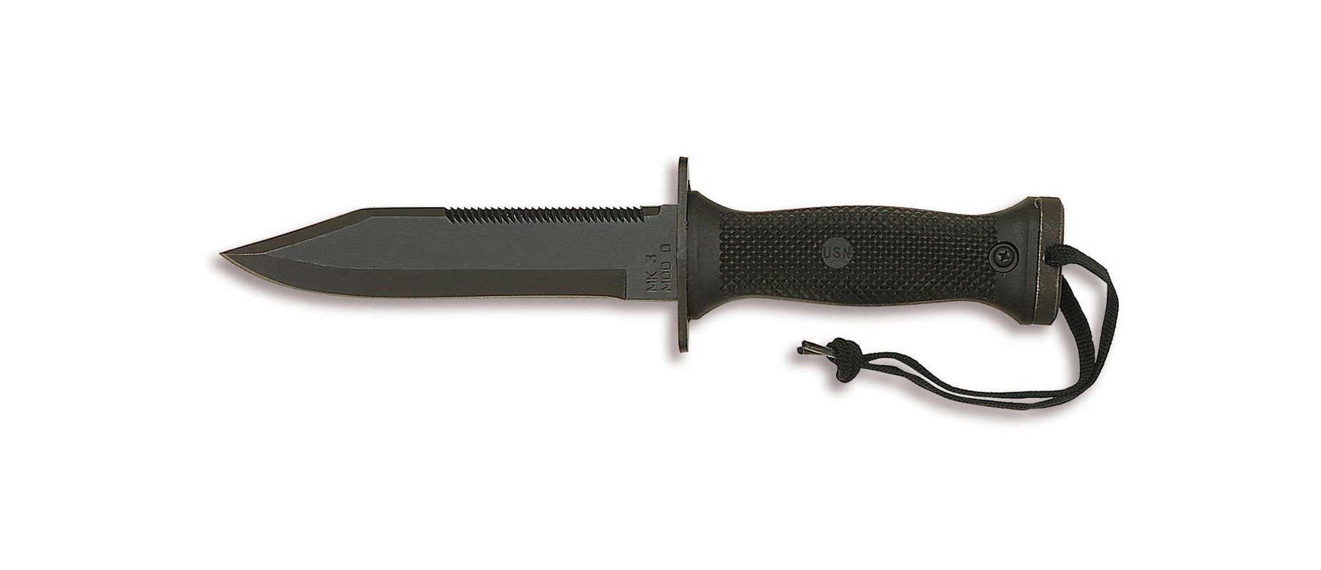 Cuchillo ONTARIO MARK 3 NAVY filo plano hoja de acero inoxidable color negro 15cm mango de goma con funda plástica color negro 6141 (USA)