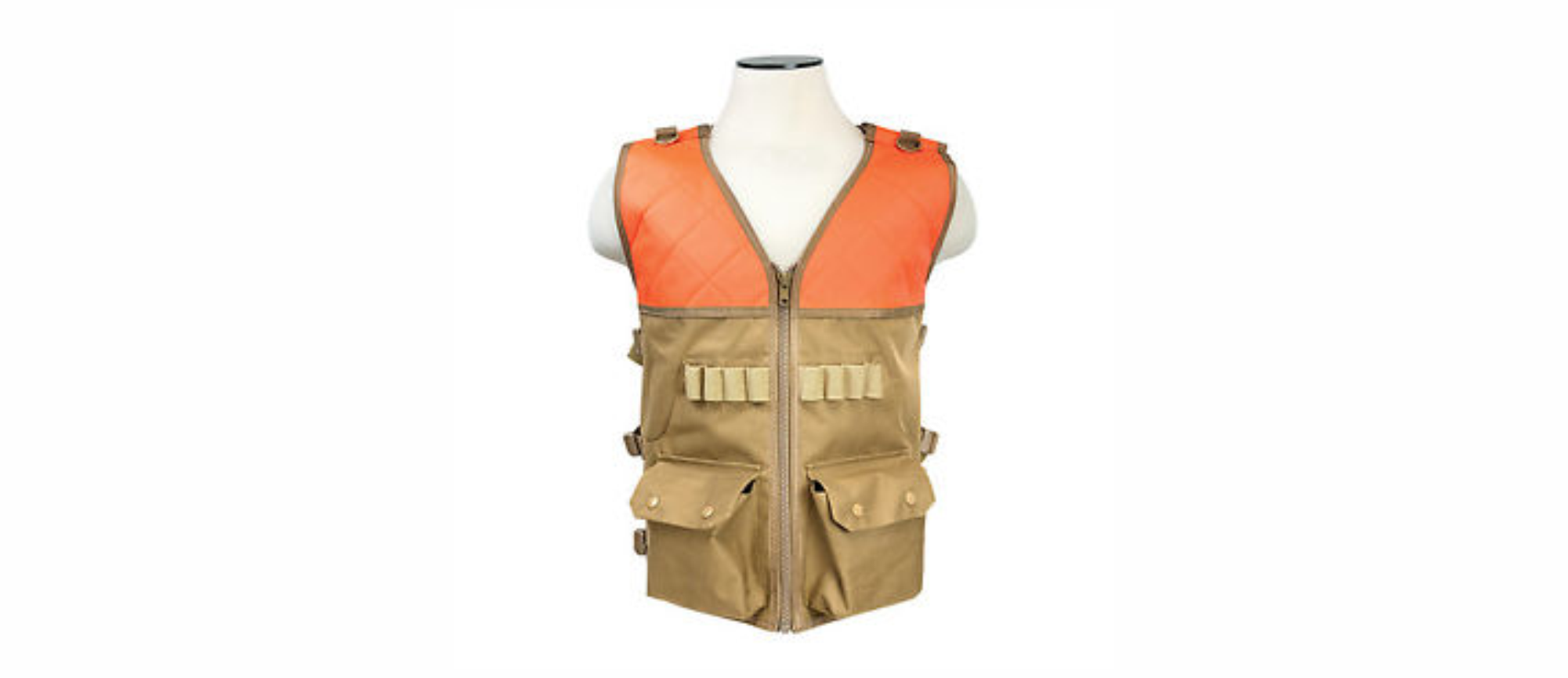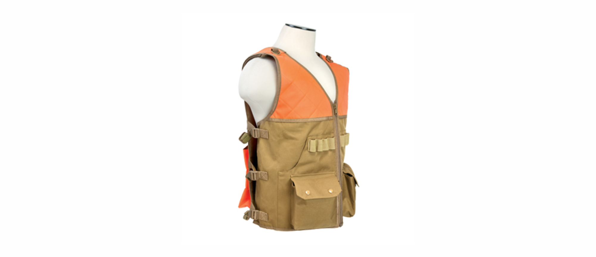Chaleco para caza NCSTAR VISM HUNTER VEST de lona con color coyote tan y anaranjado con hombreras de PVC acolchadas bolsillos grandes y porta cartuchos de 8 unidades talla única CHV2942TO