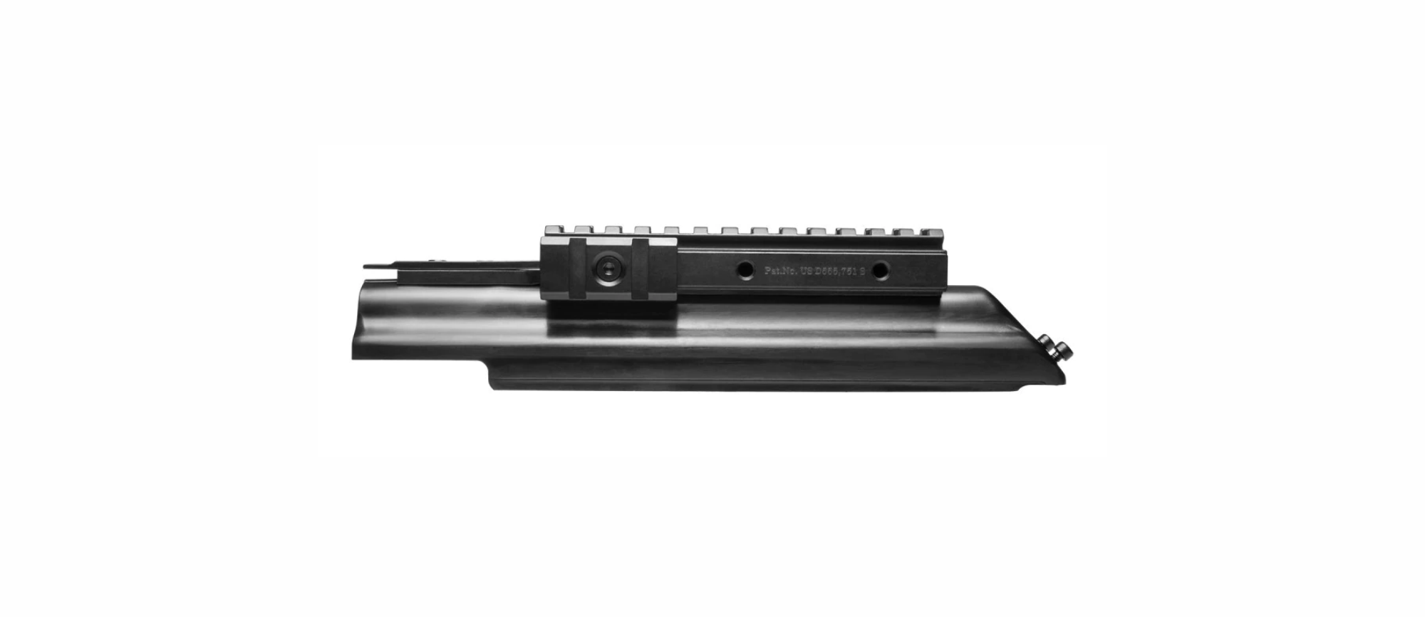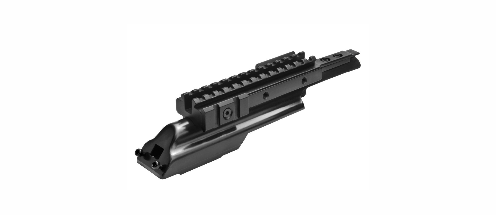 Base picatinny NCSTAR MTAK para montar miras en carabinas AK con cubiertas de metal color negro con 2 tornillos de sujeción