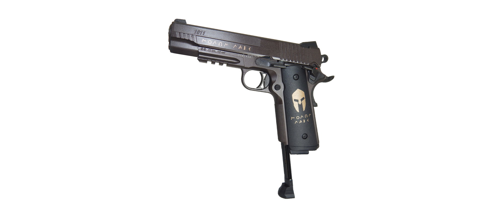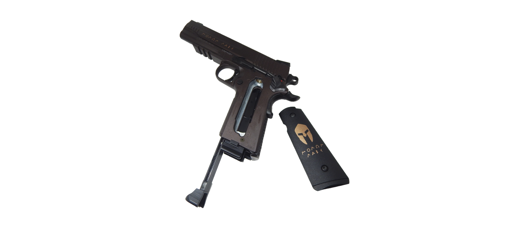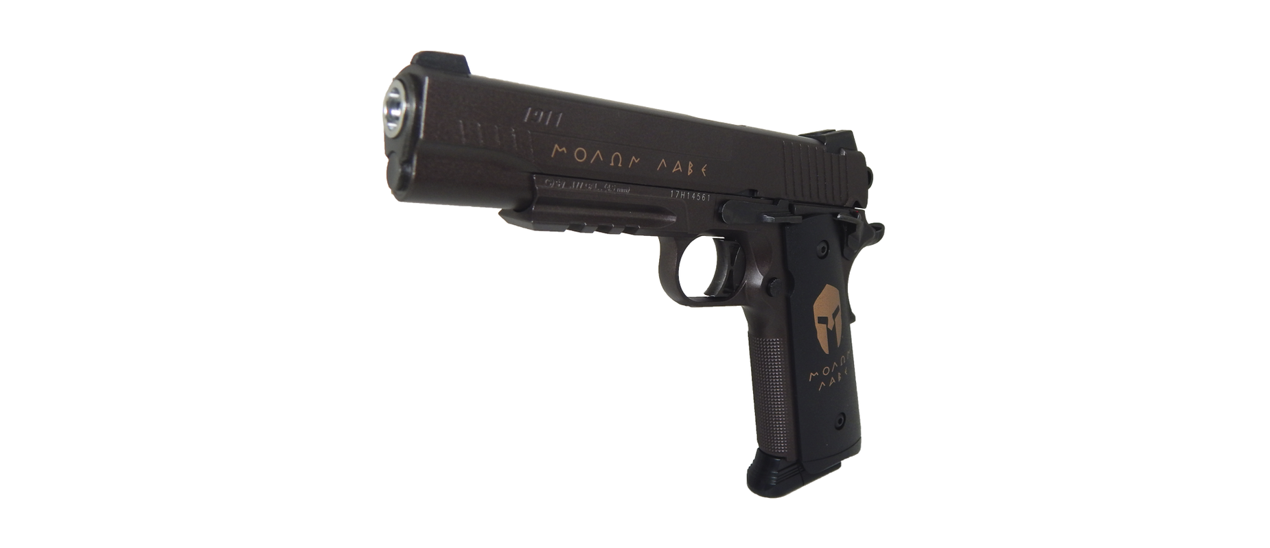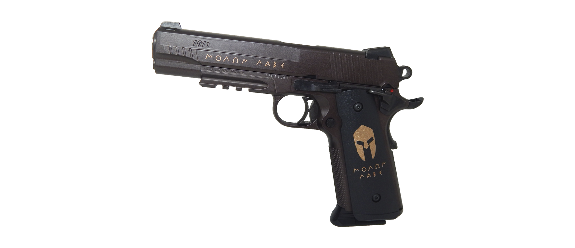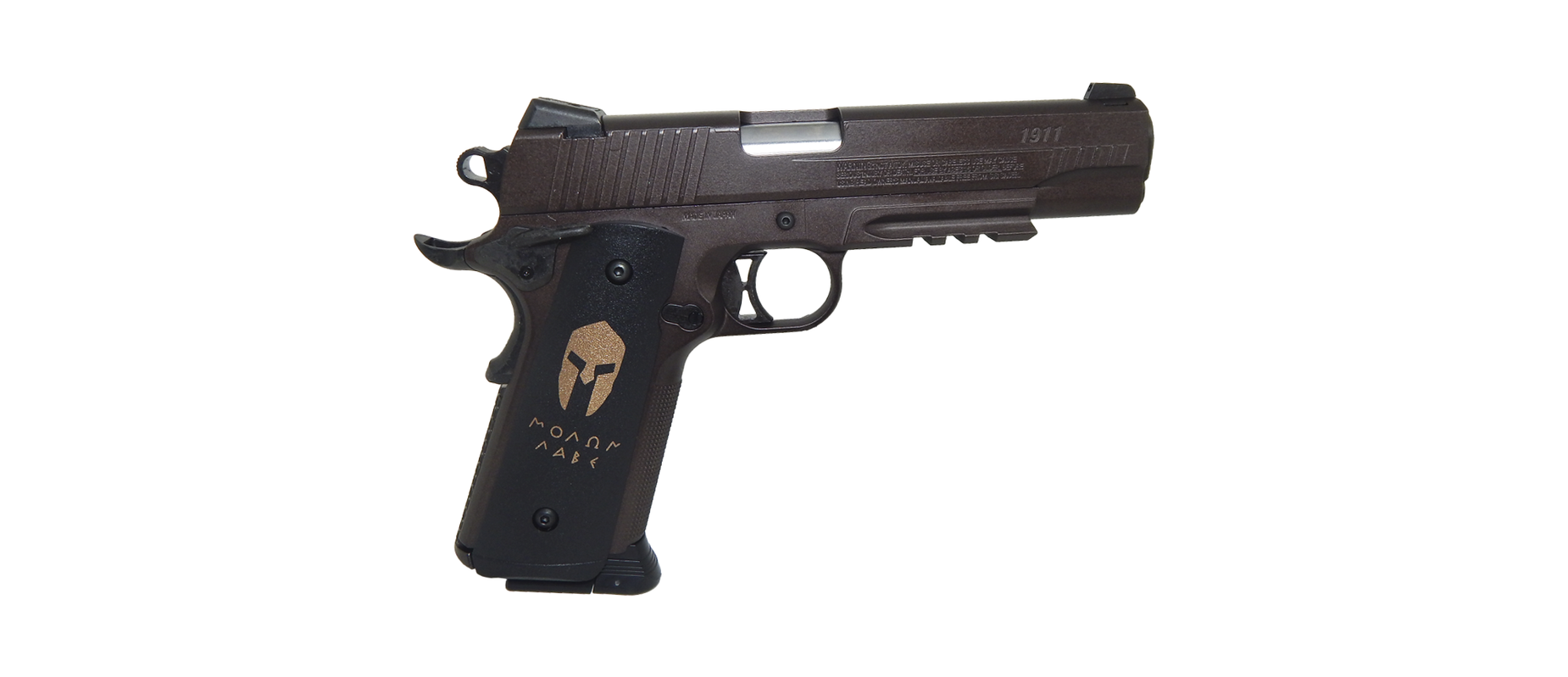 Pistola de aire SIG SAUER 1911 SPARTAN calibre 4.5BB velocidad 124m/s sistema CO2 semiautomático cacerina de 16 tiros armazón metálico color marrón con riel picatinny M1913 colocación rápida de balón CO2 AIR-1911BB-SPARTAN