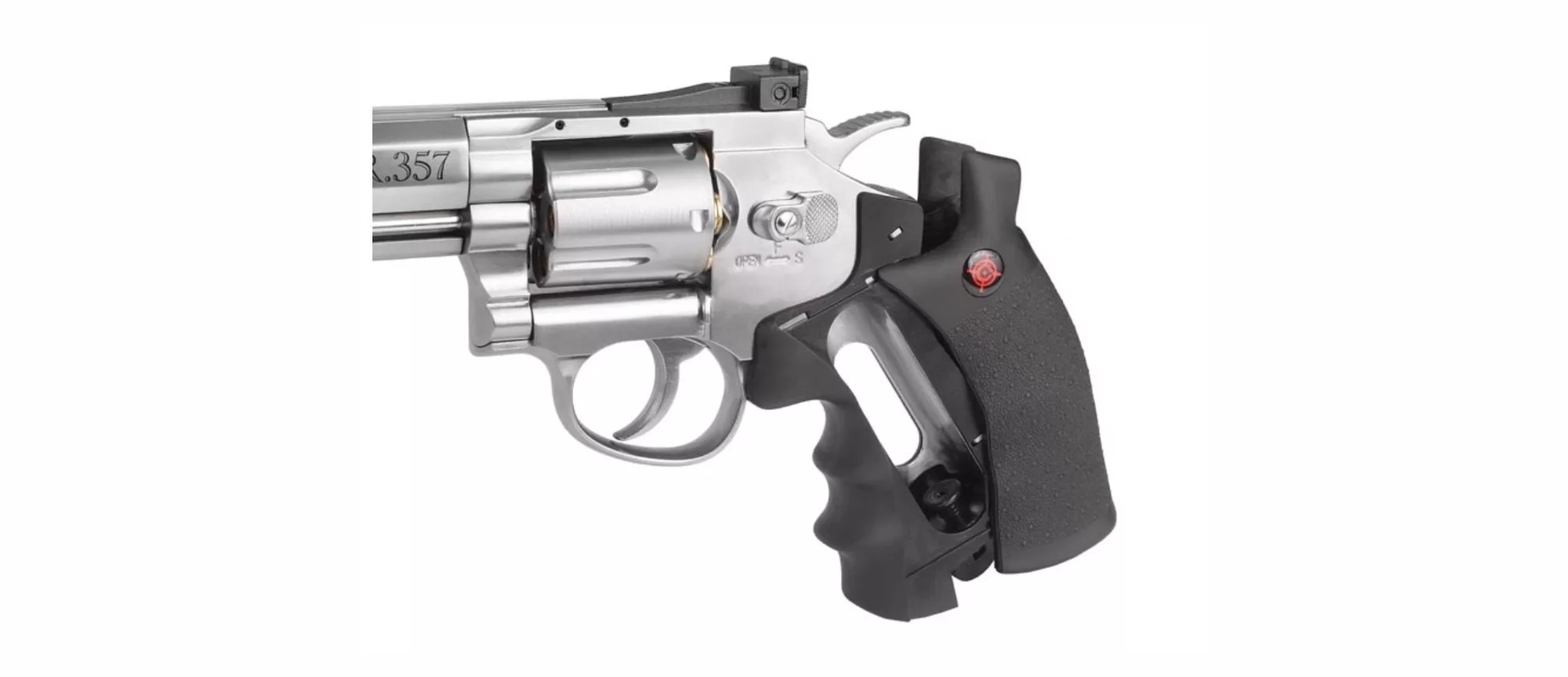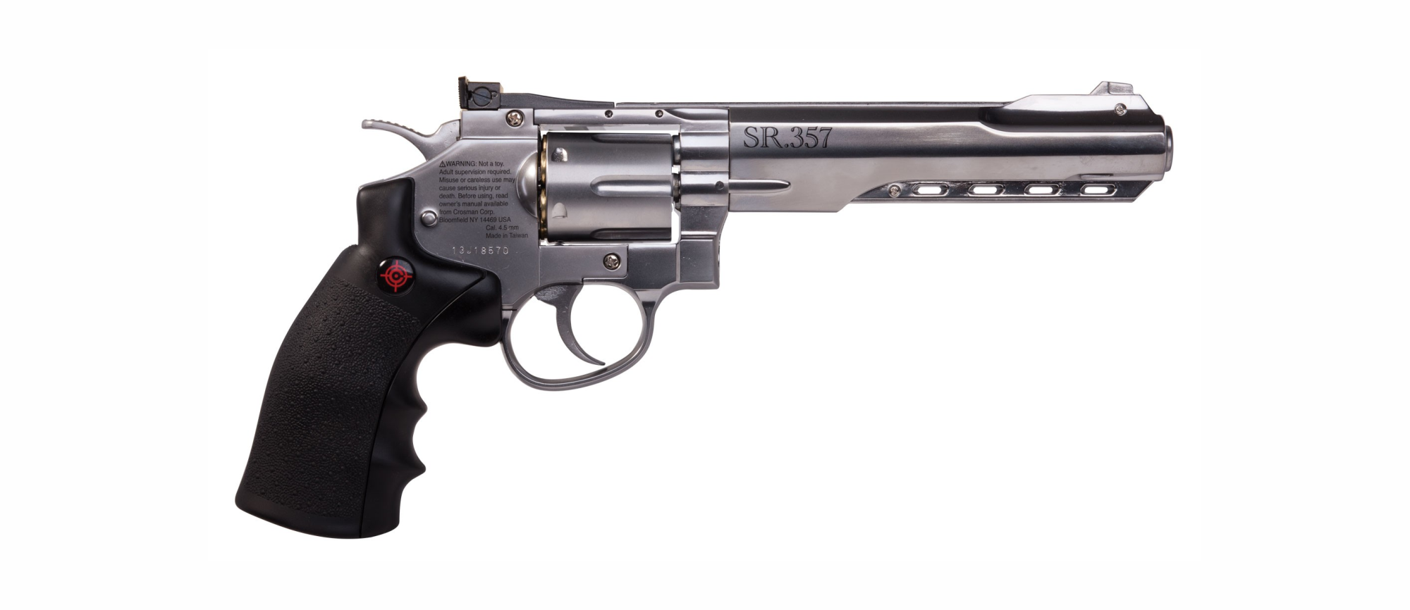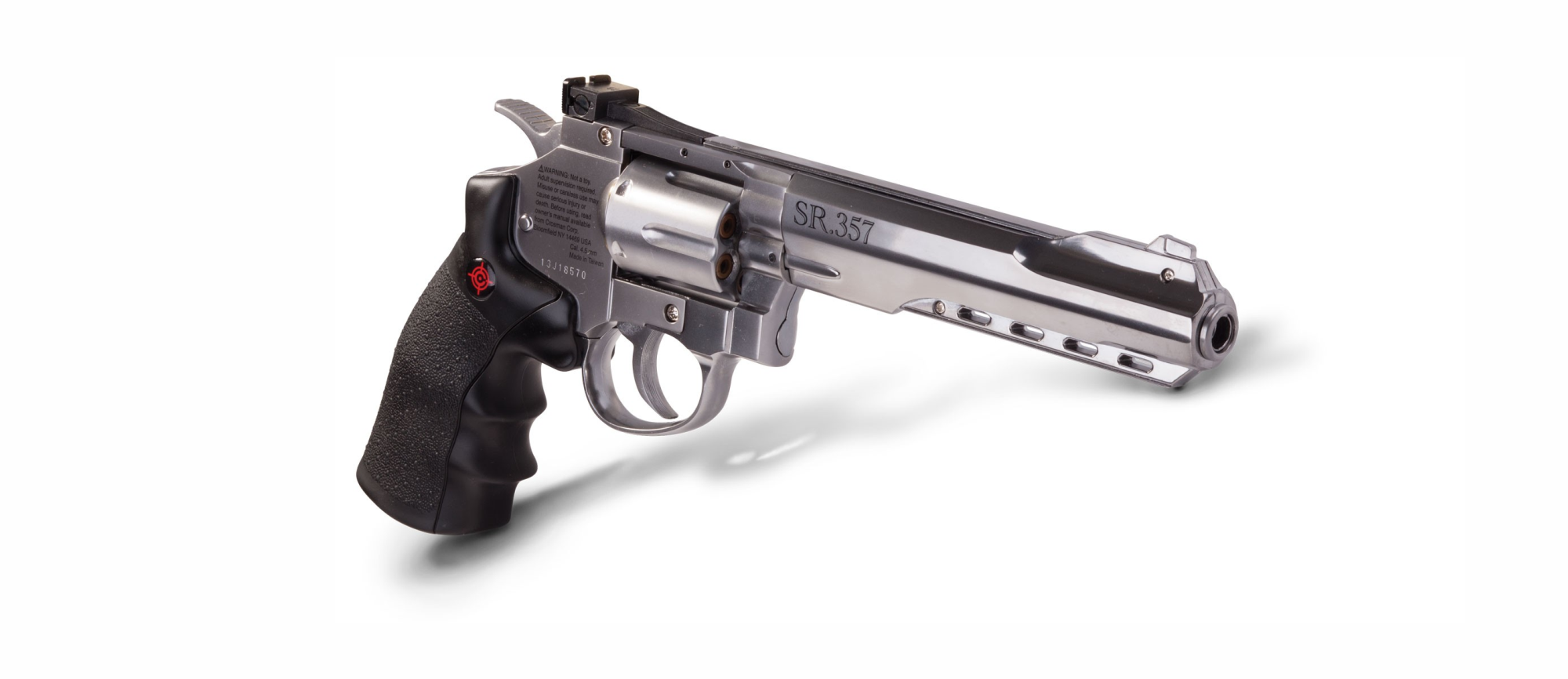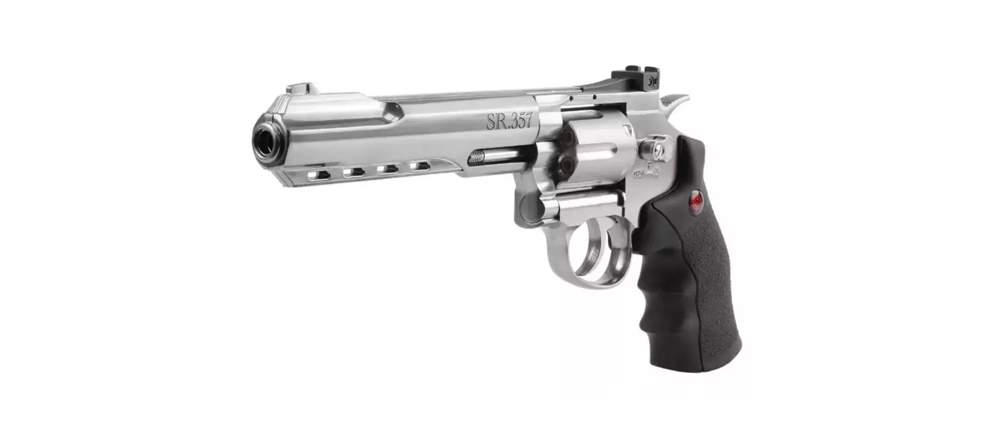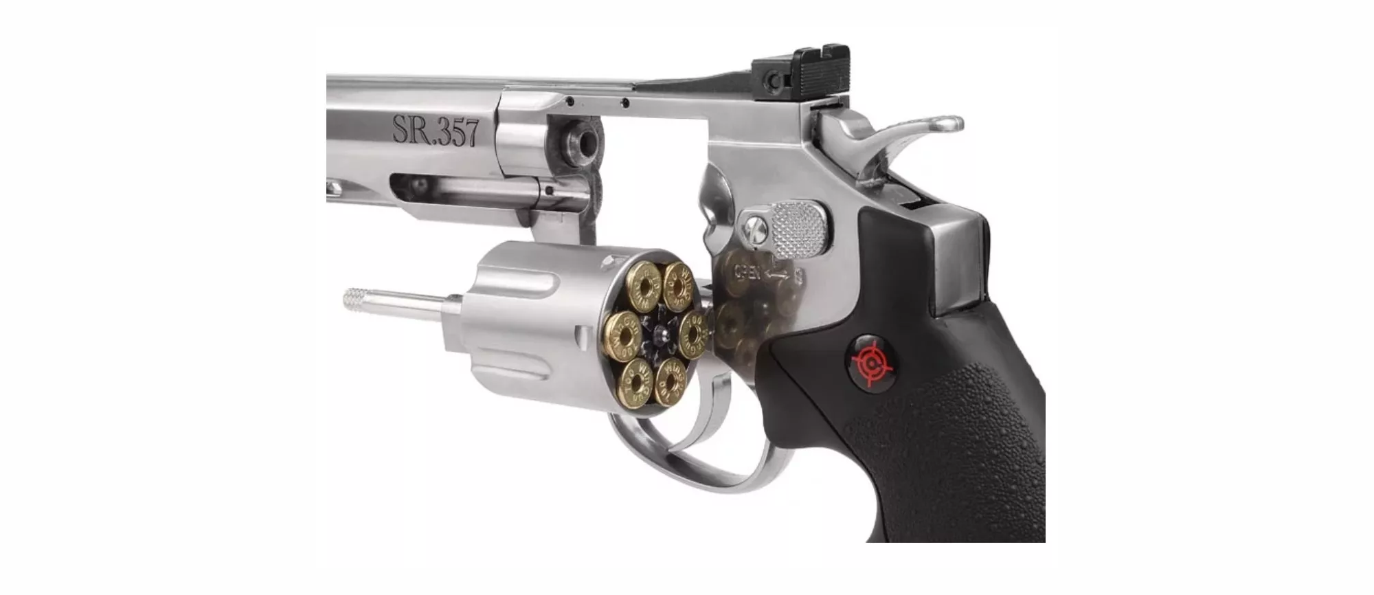 Revolver de aire CROSMAN SR357 (SILVER) calibre 4.5BB velocidad 137m/s capacidad de 6 cartuchos reutilizables mas realismo armazón metálico acabado plateado gatillo SA/DA CRVL357S