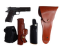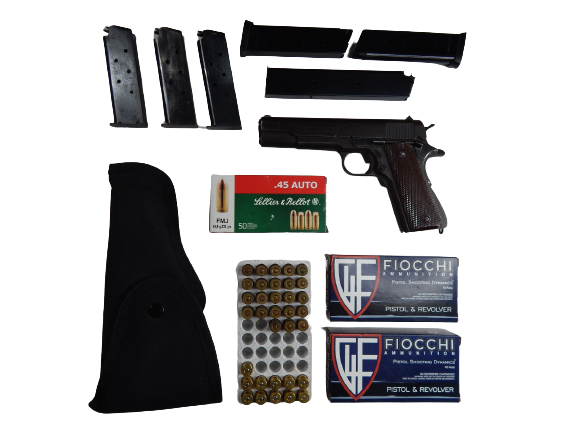 1 Funda Fobus de polímero, 1 Funda Bianchi de cuero, 1 Funda origina Colt de cuero, 3 cacerinas de 7 tiros, 2 cacerinas de 8 tiros, 1 cacerina de 15 tiros y 184 balas.
