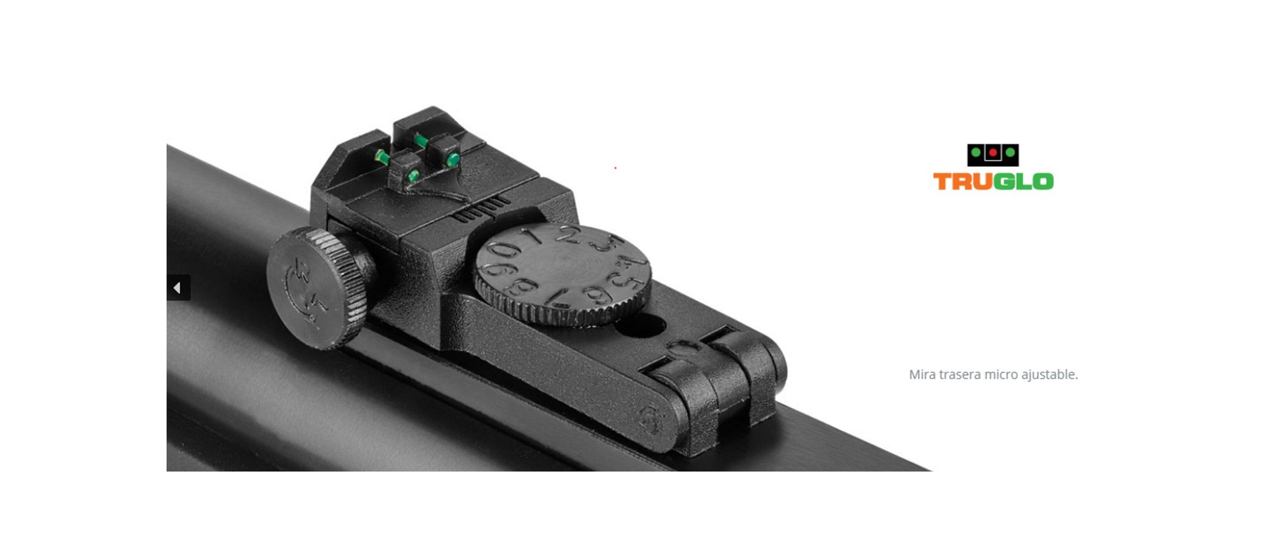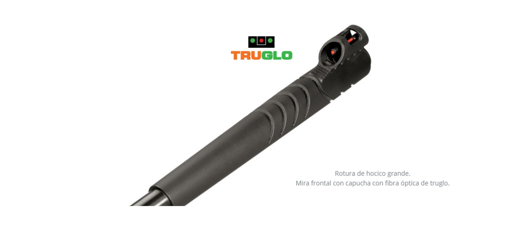 Gran apertura de boca para amartillar fácilmente con mira frontal con capucha integrada con fibra óptica Truglo.