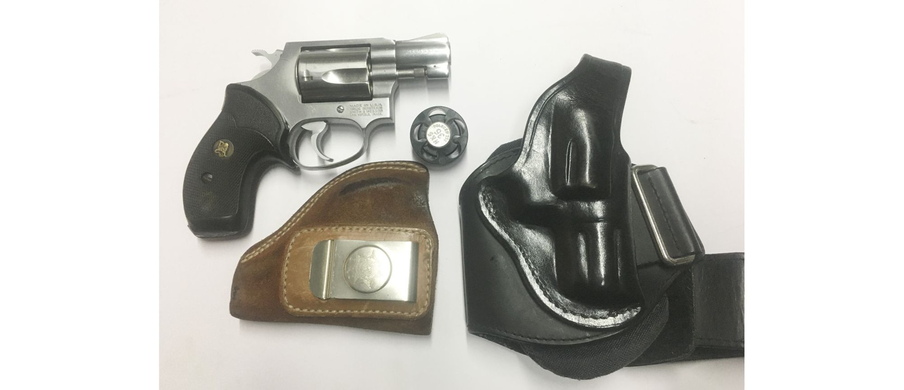 Revolver Smith & Wesson calibre 38 SPL capacidad 5 tiros acabado acero inoxidable cacha de caucho Pachmayer modelo 60 inluye funda interna Bianchi de cuero, tobiellara negra y cargador rapido