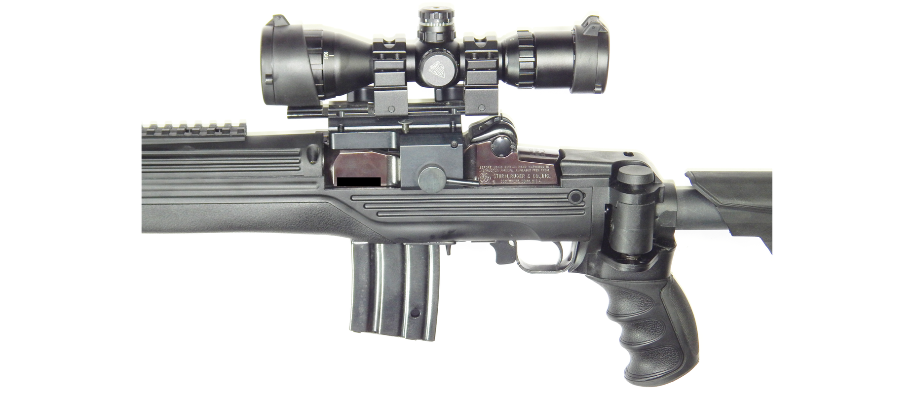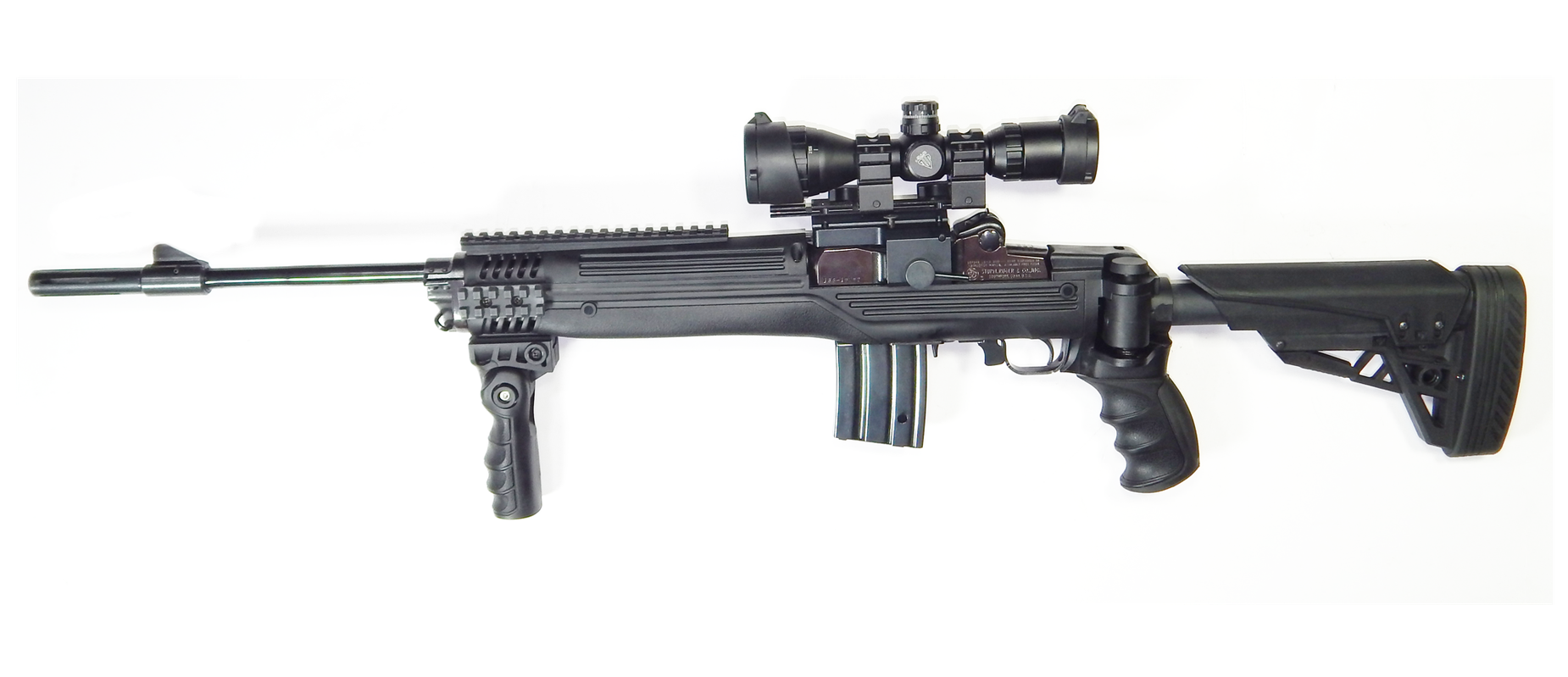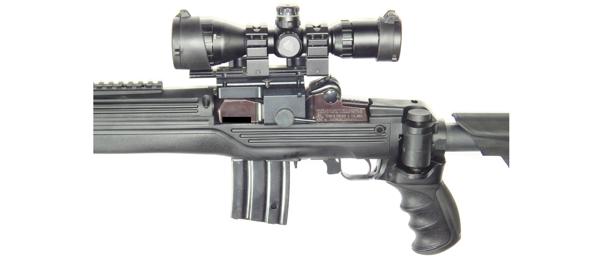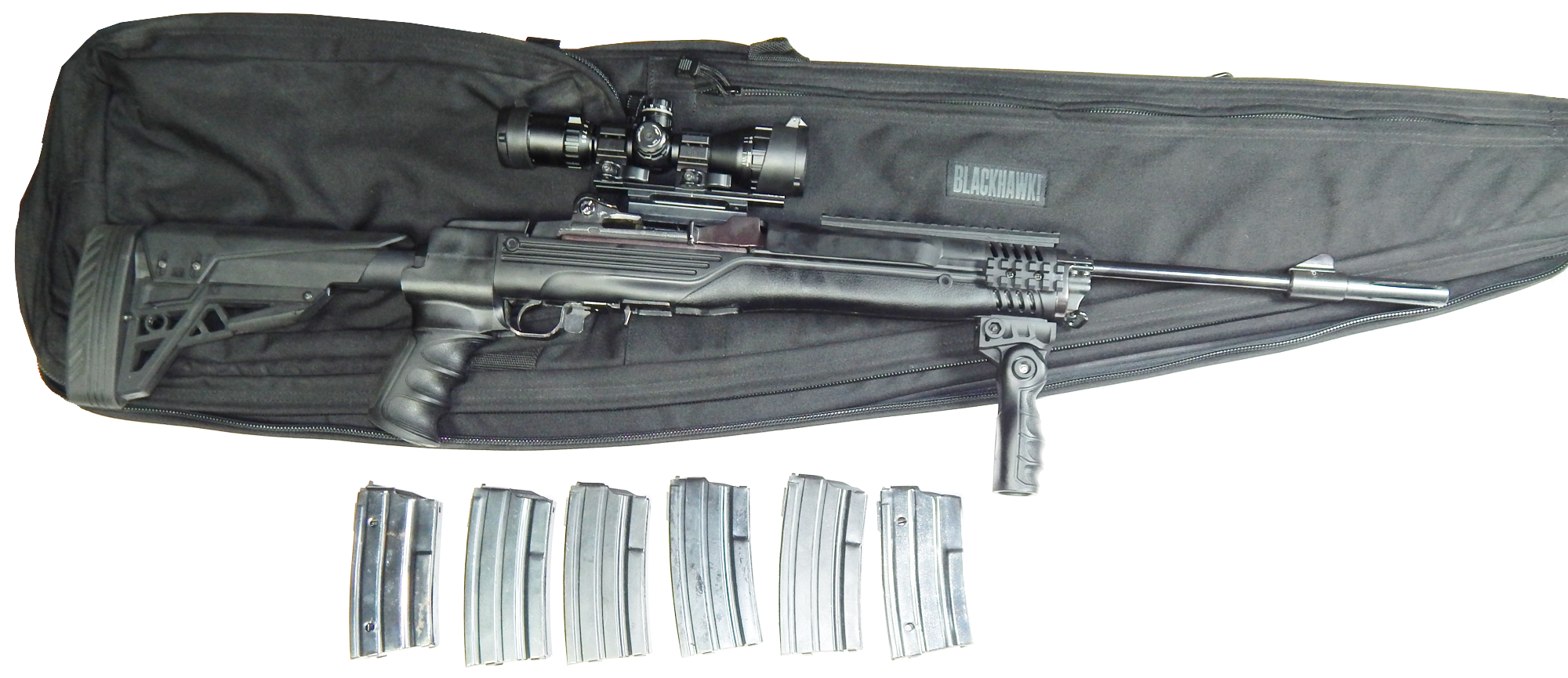 Carabina uasada RUGER MINI 14 Calibre 223 Remington sistema semiautomatico culata sintetica tactica rebatible y ajustable, rieles picatiny, mango rebatible, mira tactica UTG con reticula iluminada y control de paralelaje, anillos de colocacion rapida, funda de lona negra BlackHawk , 06 Cacerinas de 20 tiros y 01 Cacerina de 30 tiros Excelente condiciones