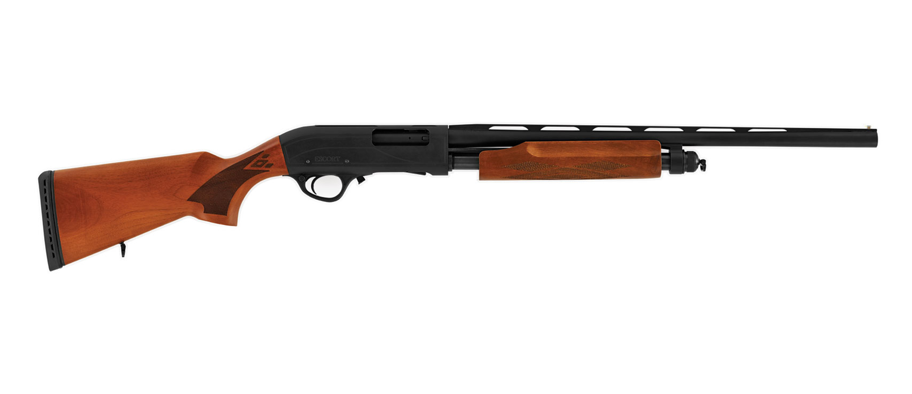 Escopeta HATSAN ESCORT-WS calibre 12 7+1 tiros sistema de bomba culata de madera fija cañón cromado ventilado de 28 pulgadas acabado pavonado con 05 chokes cantonera regulable y argollas